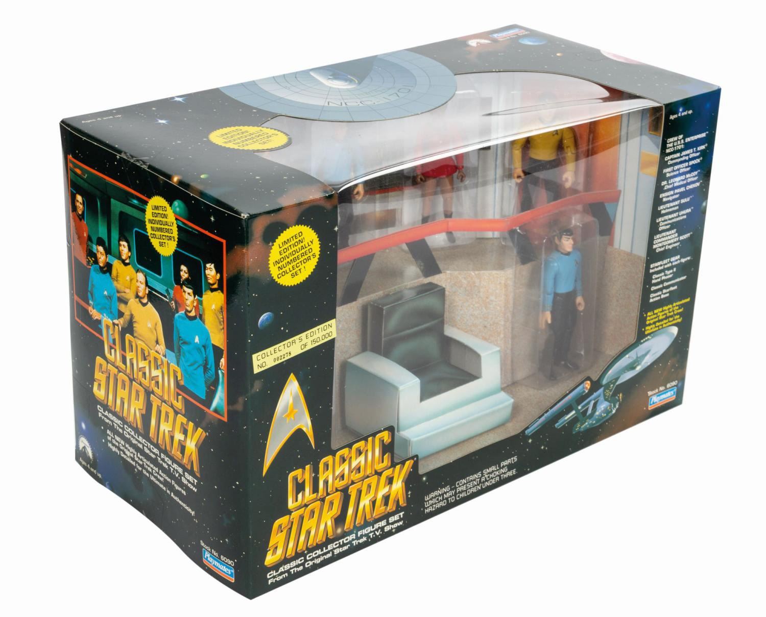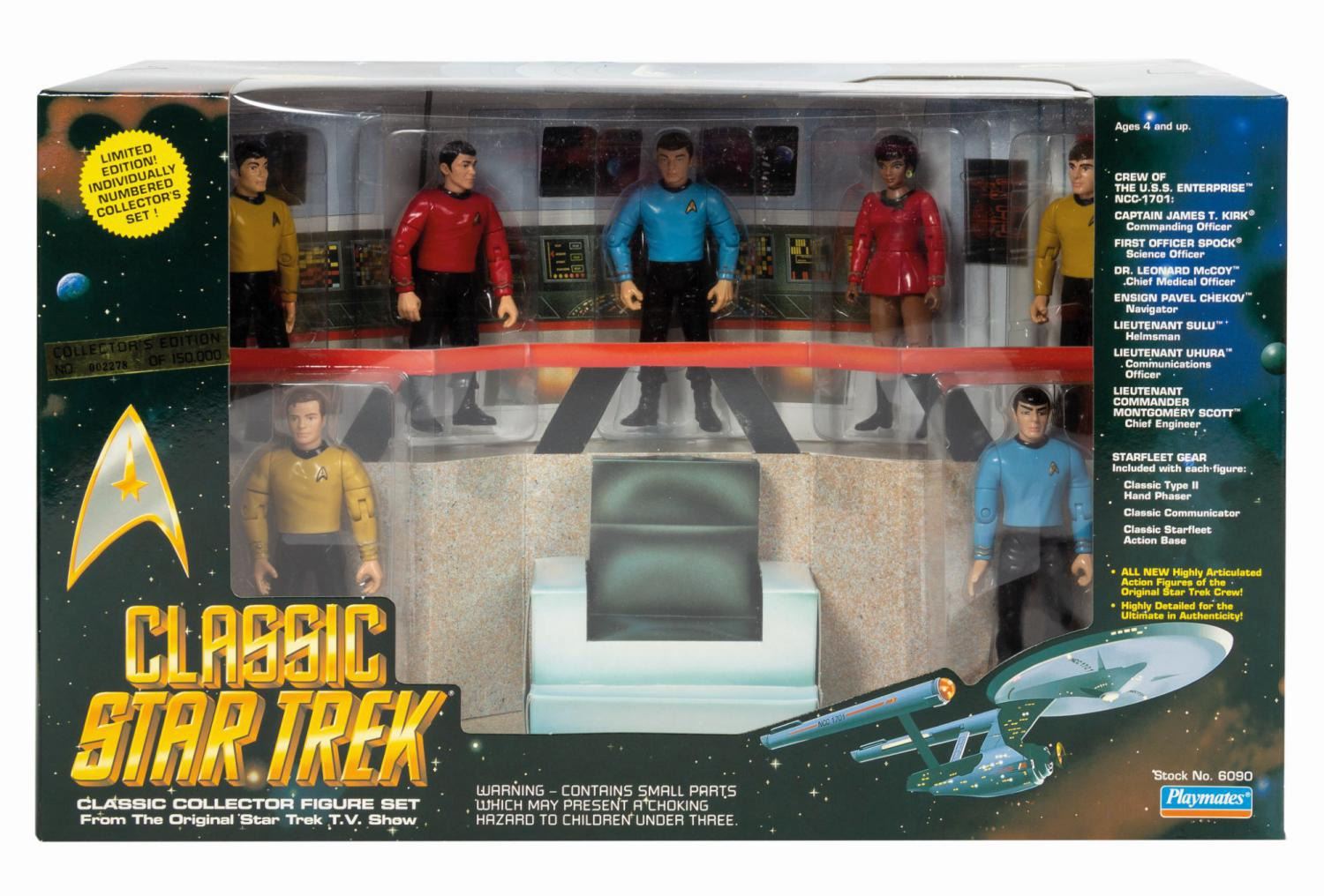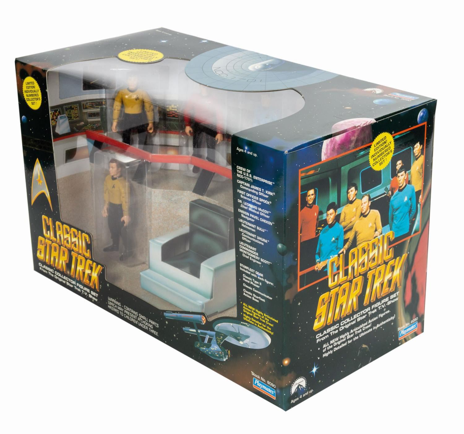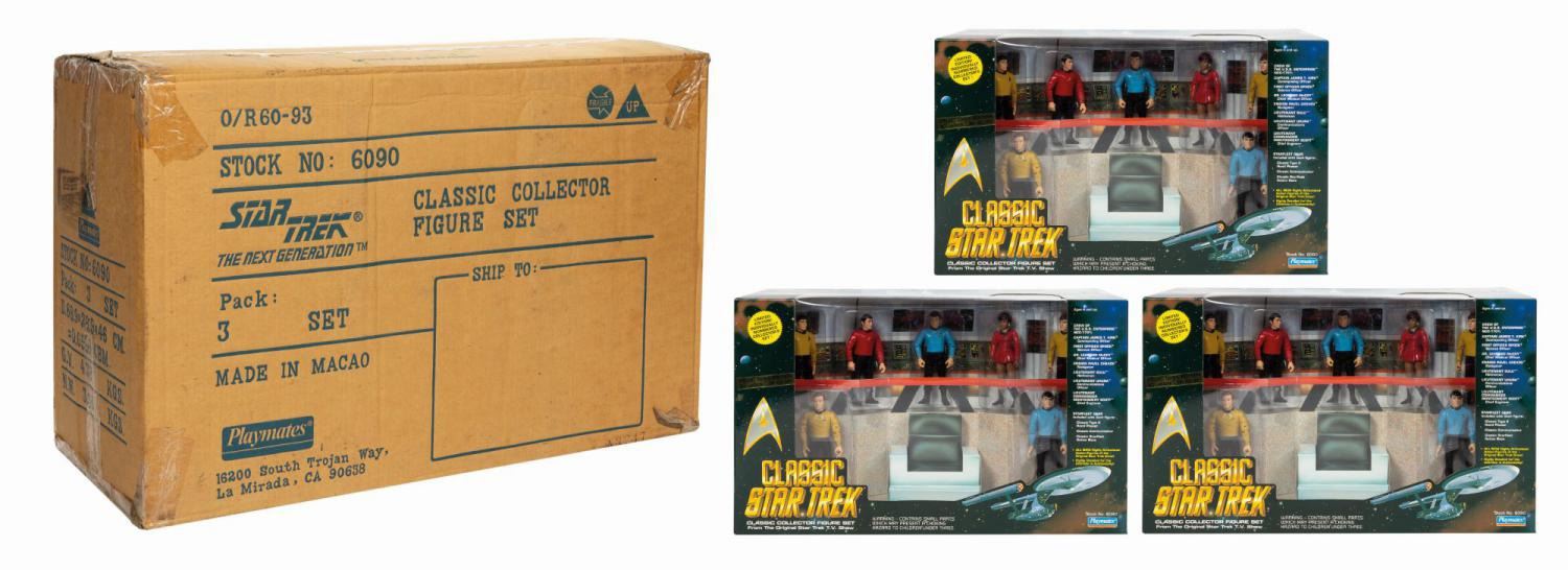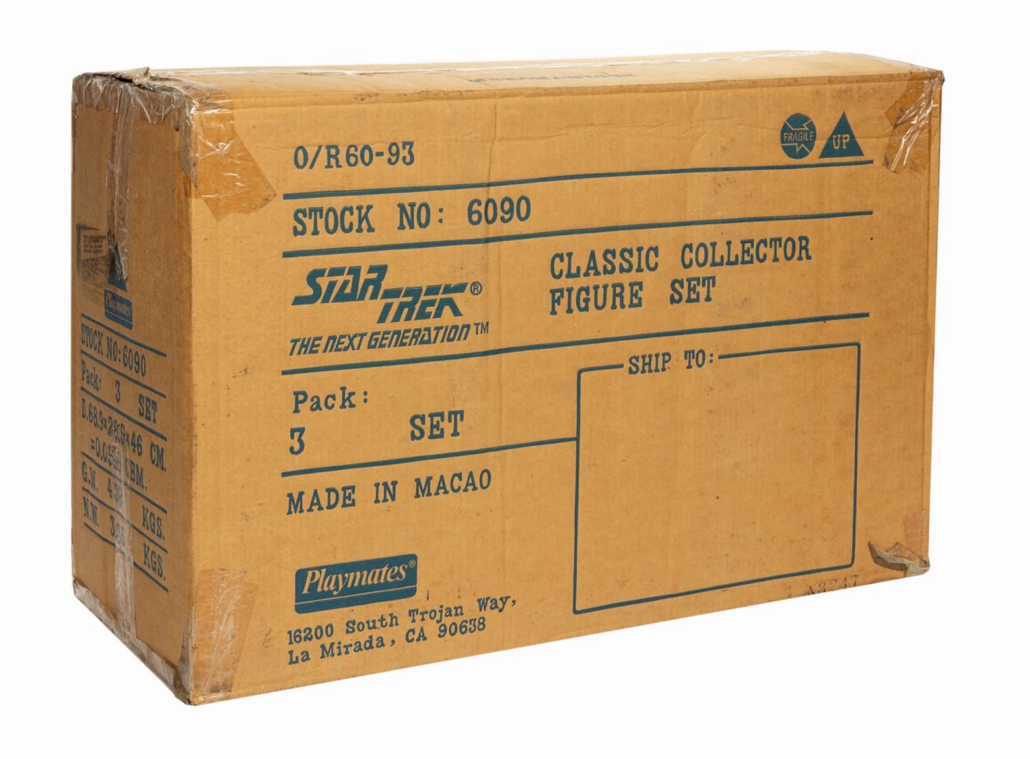 (Playmates, 1993) A complete factory cardboard case containing (3) limited edition Star Trek Classic Collection figure sets. Only removed from their brown factory box for photography and condition inspection, each set contains (7) figures based on The Original Series that are displayed in through their windowed box recreation of the bridge. Each set is uniquely numbered, with this case containing sets 002277-002279 of 150,000, and each measures 10.5"x17" and 8.5" deep. The condition is very fine, with minor box wear to the sets including a small tear at the edge of box 002279 that is attributed to the manufacturing process.