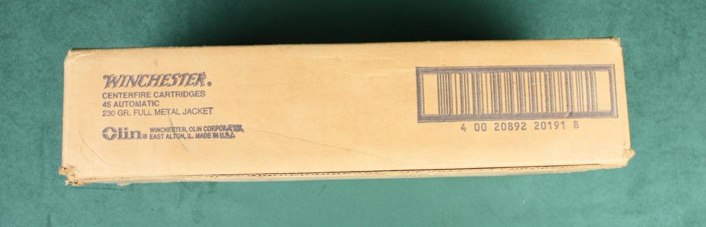 Case of 500 rounds (10 boxes) of Winchester .45 automatic caliber ammo, 230 grain in factory cardboard shipping box. Est.: $100-$200.