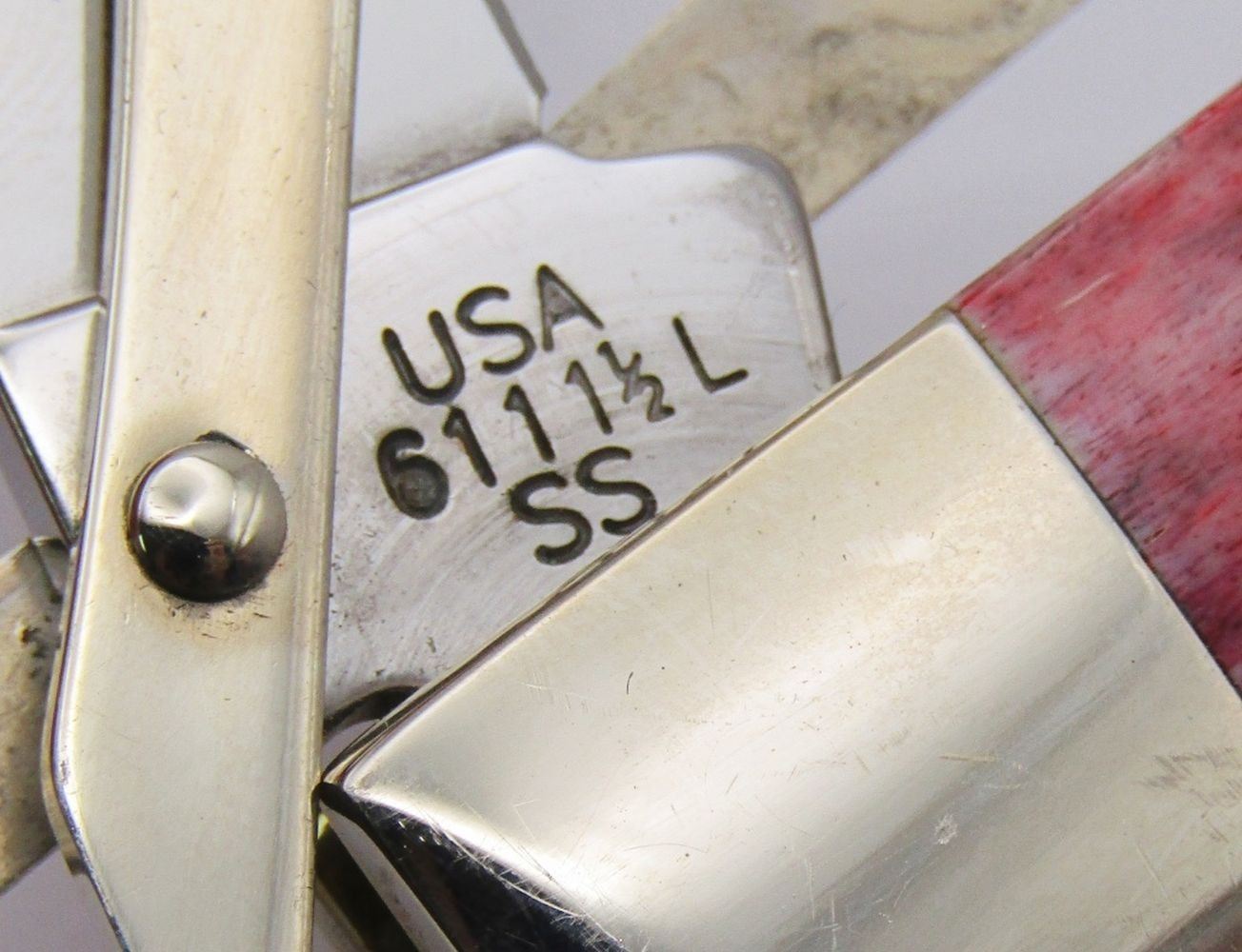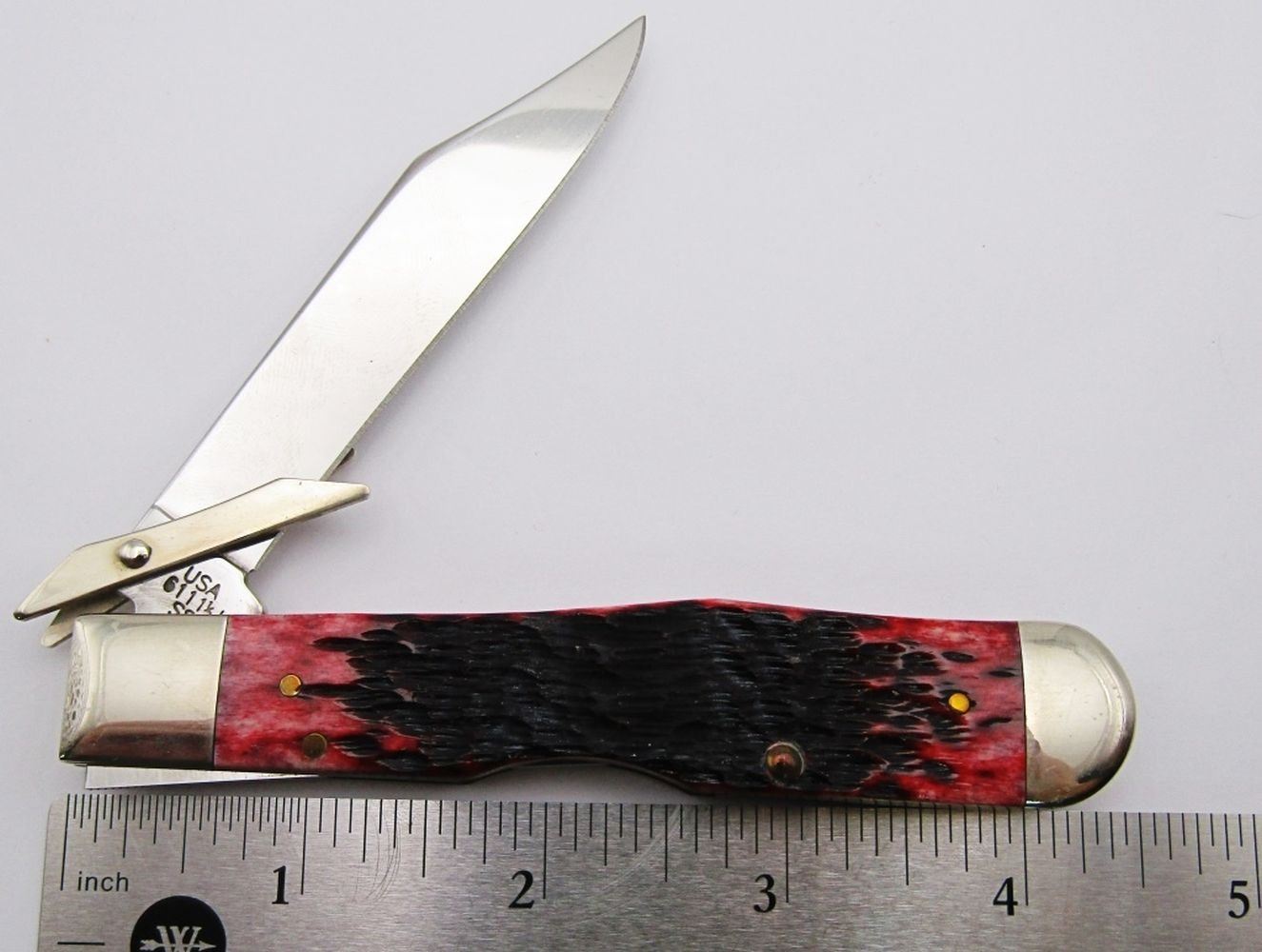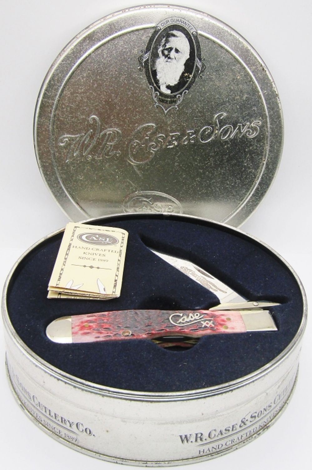 Swing Guard Folding Knife in Collecible Tin with Red Jigged Bone Handle and Stainless Steel Blades; MINT Condition; Lockback Type!