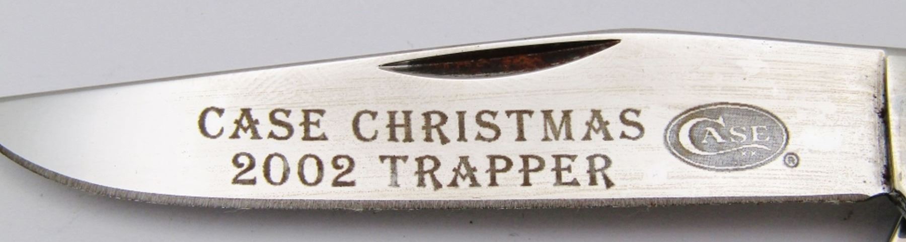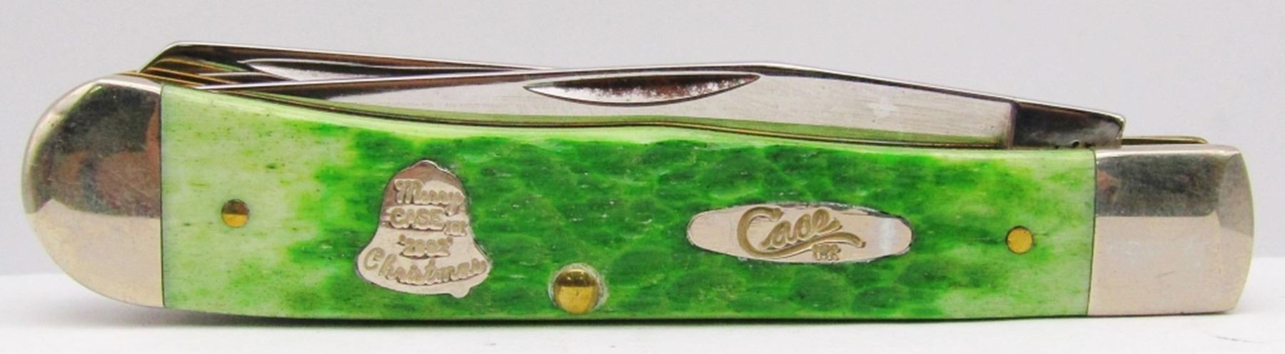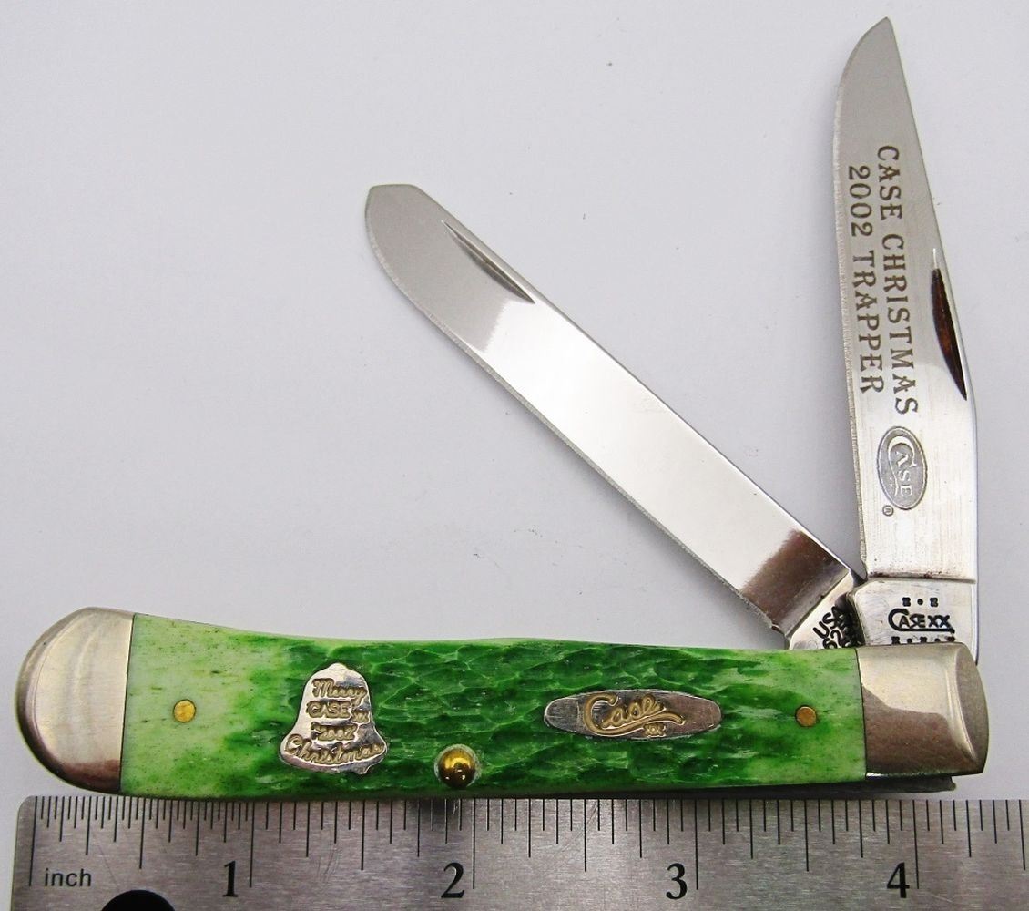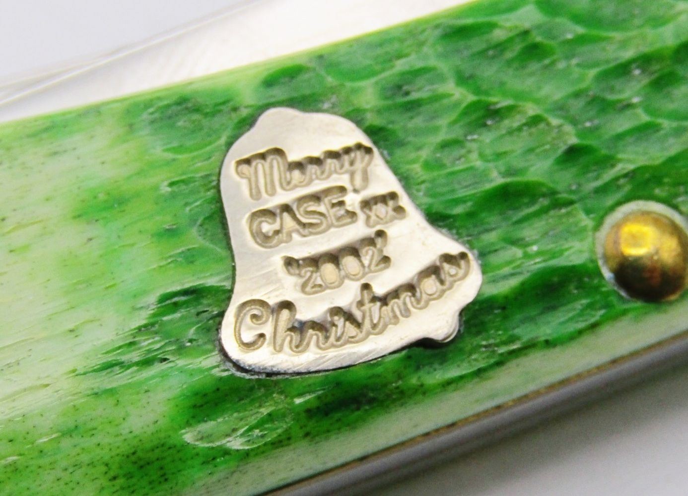 Bell Shield Stamped "Merry Case XX '2002' Christmas"; Master Blade etched "Case Christmas 2002 Trapper"; Green Jigged Bovine Bone; Like New Condition!