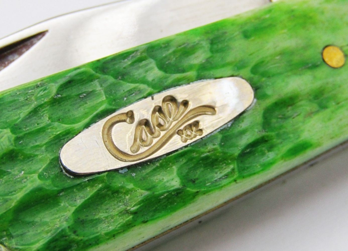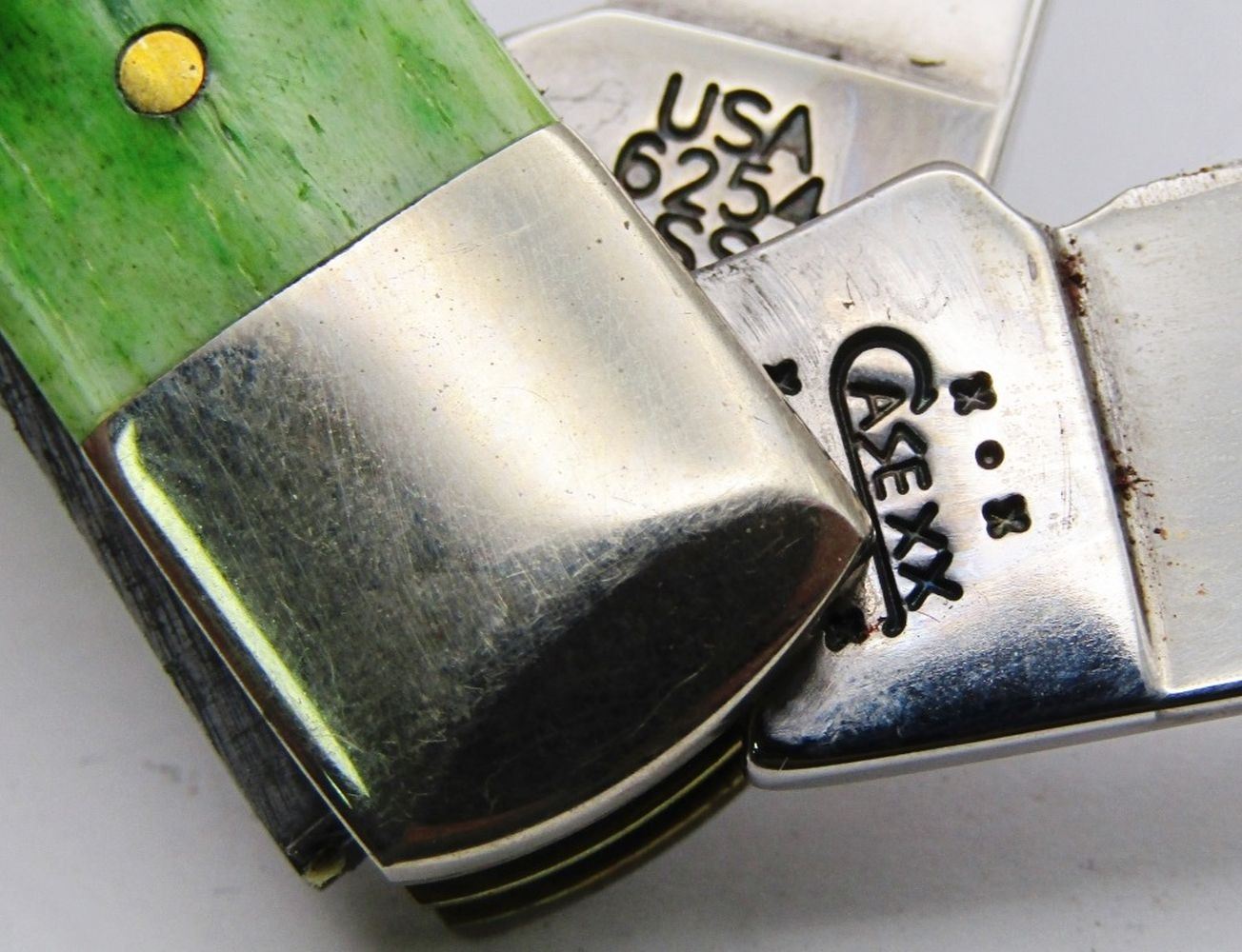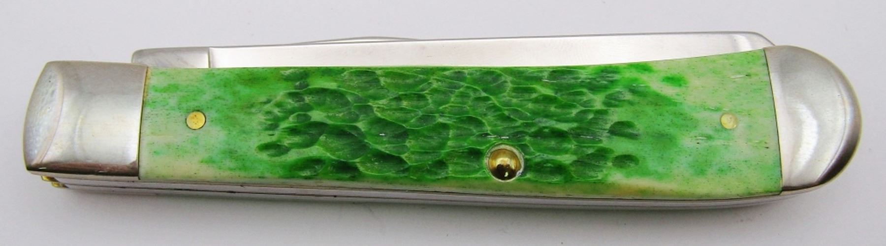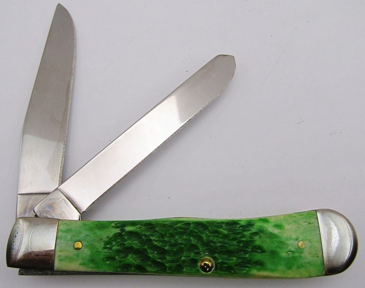 Bell Shield Stamped "Merry Case XX '2002' Christmas"; Master Blade etched "Case Christmas 2002 Trapper"; Green Jigged Bovine Bone; Like New Condition!