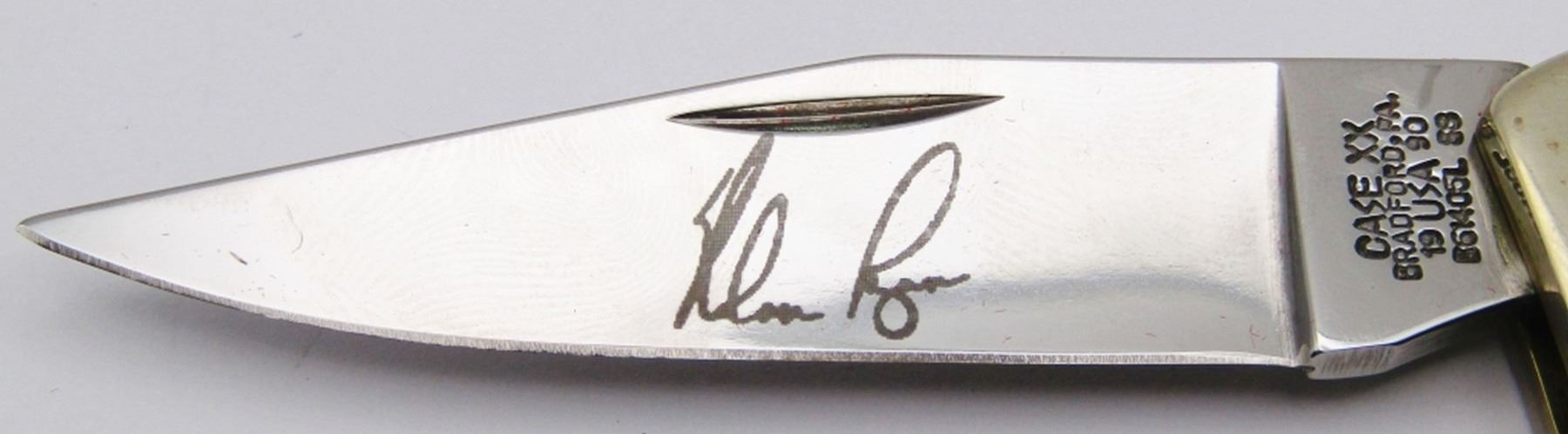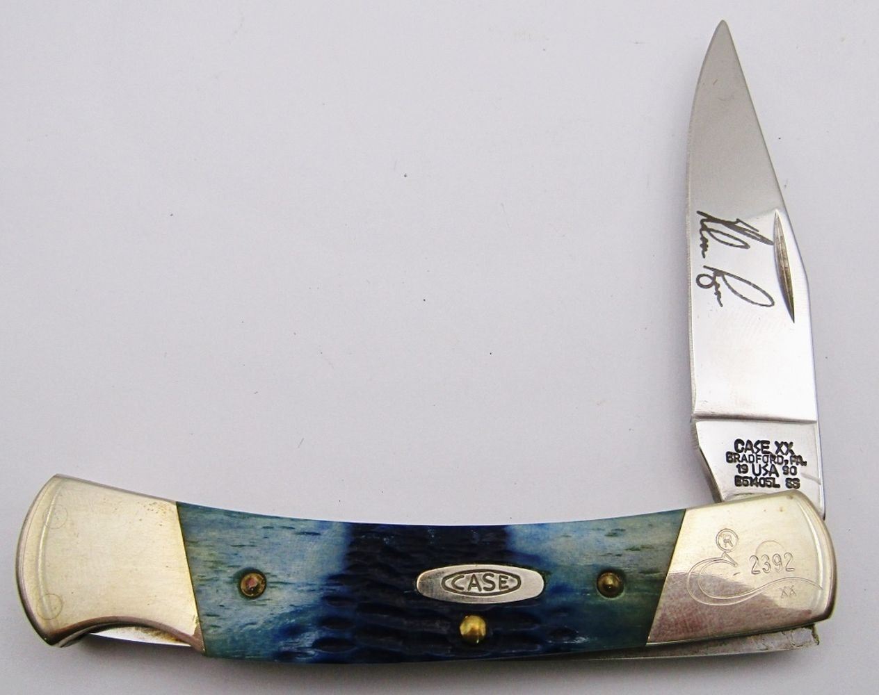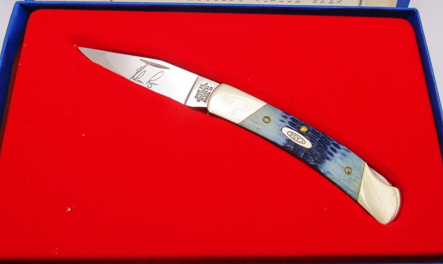 CaseXX Small Blue Bone Model #1049 Lockback Knife; Nolan Ryan 5,000th Career Strikeout Commemorative. Jigged Blue Bone Handle; Etched signature of Noal Ryan on Blade! NEW IN BOX!