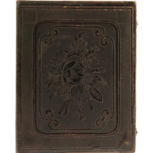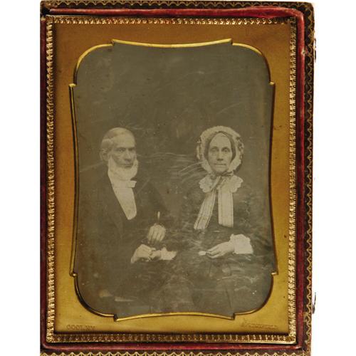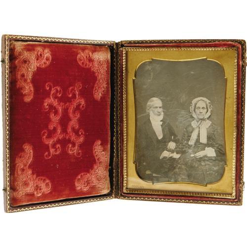 <B>Cased 1/2 Plate Daguerreotype of an Elderly Couple.</B></I> A charming studio portrait, circa 1850, showing a serious man and his placid wife holding hands. The plain, early brass mat over the image is stamped "Cooley" and "Springfield". This identifies the sitters as having been captured by known photographer Otis H. Cooley of Springfield, Massachusetts. Light scratches on the protective glass plate and a few minor abrasions on the daguerreotype, which is in overall fine condition. The leatherette case is embossed with a floral motif on the front panel and a geometric design on the back panel. Wear is evident on the highest points. Fine condition overall.