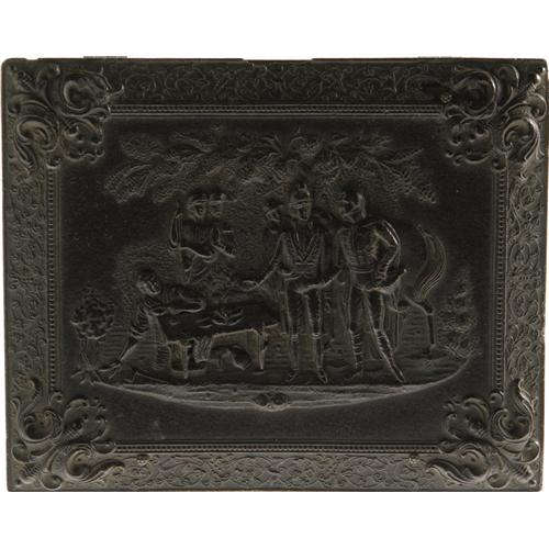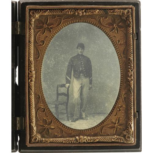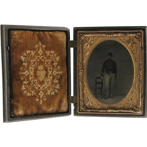 <B>Cased 1/4th Plate Tintype of a Federal Private.</B></I> The subject in this full length studio portrait wears a nine-button shell jacket having bold piping on each sleeve. A kepi, military trousers, and vest complete his outfit. The image is in a brass mat under glass and housed in a gutta-percha case molded on both sides with the largely mythical scene of Francis Marion offering a British officer sweet potatoes during the American Revolution. Minor chipping to the case's extremities and somewhat loose hinges. Overall fine condition.<BR><BR><b>Shipping:</b> Miscellaneous Collectibles, Smal (<a target="_blank" href="http://www.heritageauctions.com/common/shipping.php">view shipping information</a>)