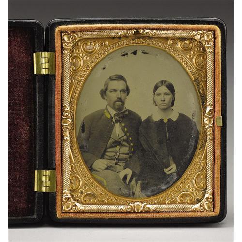 <B>Cased 1/6th Plate Ambrotype of an Early War Volunteer and His Wife.</B></I> The confident fellow in this poignant image has the merest hint of a smile and is likely a Confederate cavalryman going off to war. His militia-style shell jacket has what appear to be nine eagle buttons. A vest and trousers of a lighter fabric than the jacket's complete the uniform. Light gold paint colors the buttons, a strip of piping on the collar, and a stripe down the soldier's pant leg. The supportive young bride in this image has a brooch at her throat bearing her husband's likeness. Housed in a gutta-percha Union case embossed with Cupid and a stag on both sides. The emulsion on this ambrotype is smooth and intact where such really counts; however, there are several small scrapes in a perfect oval suggesting that the plate was originally under a smaller mat.<BR><BR><b>Shipping:</b> Miscellaneous Collectibles, Smal (<a target="_blank" href="http://www.heritageauctions.com/common/shipping.php">view shipping information</a>)