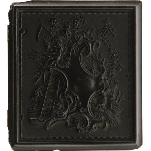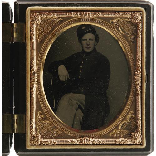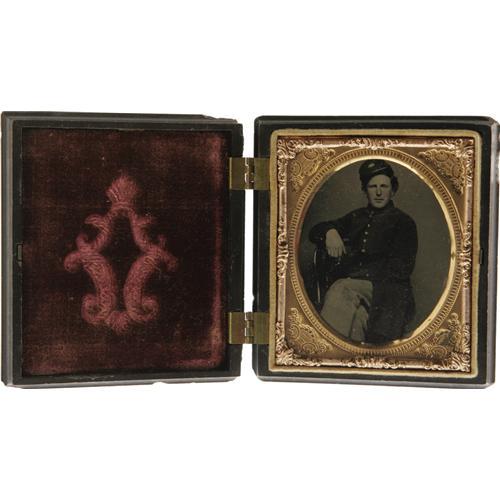 <B>Cased 1/6th Plate Tintype of a Federal Soldier Wearing a 22nd Corps Badge.</B></I> A confident Union private strikes a casual seated pose for the photographer. The significance of this image can be found in the five-branched 22nd Corps badge affixed to the crown of his kepi. This corps was formed early in 1863 for the defense of Washington and became heavily engaged at Fort Stevens during Jubal Early's July, 1864 attack on the Federal capital. The photograph, secured in a brass mat under glass, is housed in a gutta-percha case molded with a fanciful agrarian scene on both sides. Some minor chipping to the extremities of the case, else very fine condition.<BR><BR><b>Shipping:</b> Miscellaneous Collectibles, Smal (<a target="_blank" href="http://www.heritageauctions.com/common/shipping.php">view shipping information</a>)