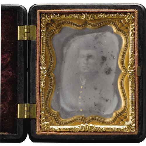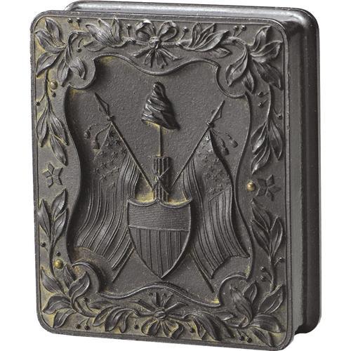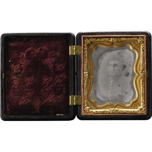 <B>Cased 1/9th Plate Tintype of a Union Soldier.</B></I> This generic head-and-shoulders studio portrait carries two revenue stamps on its underside and is housed in a remarkable gutta-percha Union case. Both sides are deeply molded with a Union shield, crossed flags and a Liberty cap resting upon a fasces. The image's protective glass is milky where exposed to the photograph, which is quite clear when removed from the matt. The case is in excellent condition with only the smallest edge nicks. <BR><BR><b>Shipping:</b> Miscellaneous Collectibles, Smal (<a target="_blank" href="http://www.heritageauctions.com/common/shipping.php">view shipping information</a>)