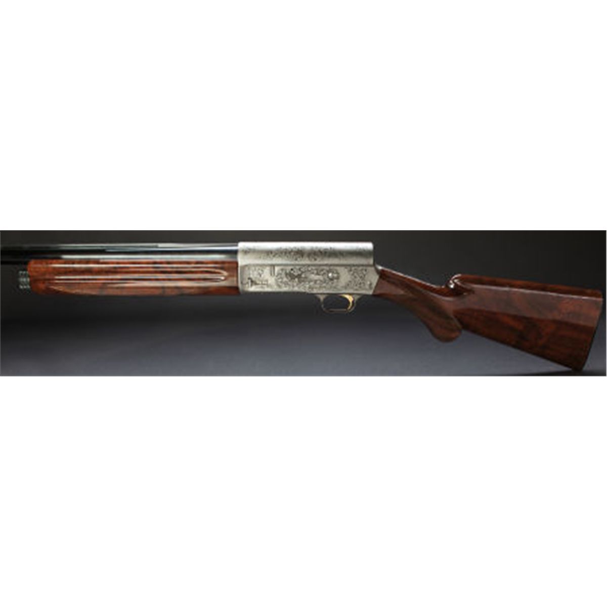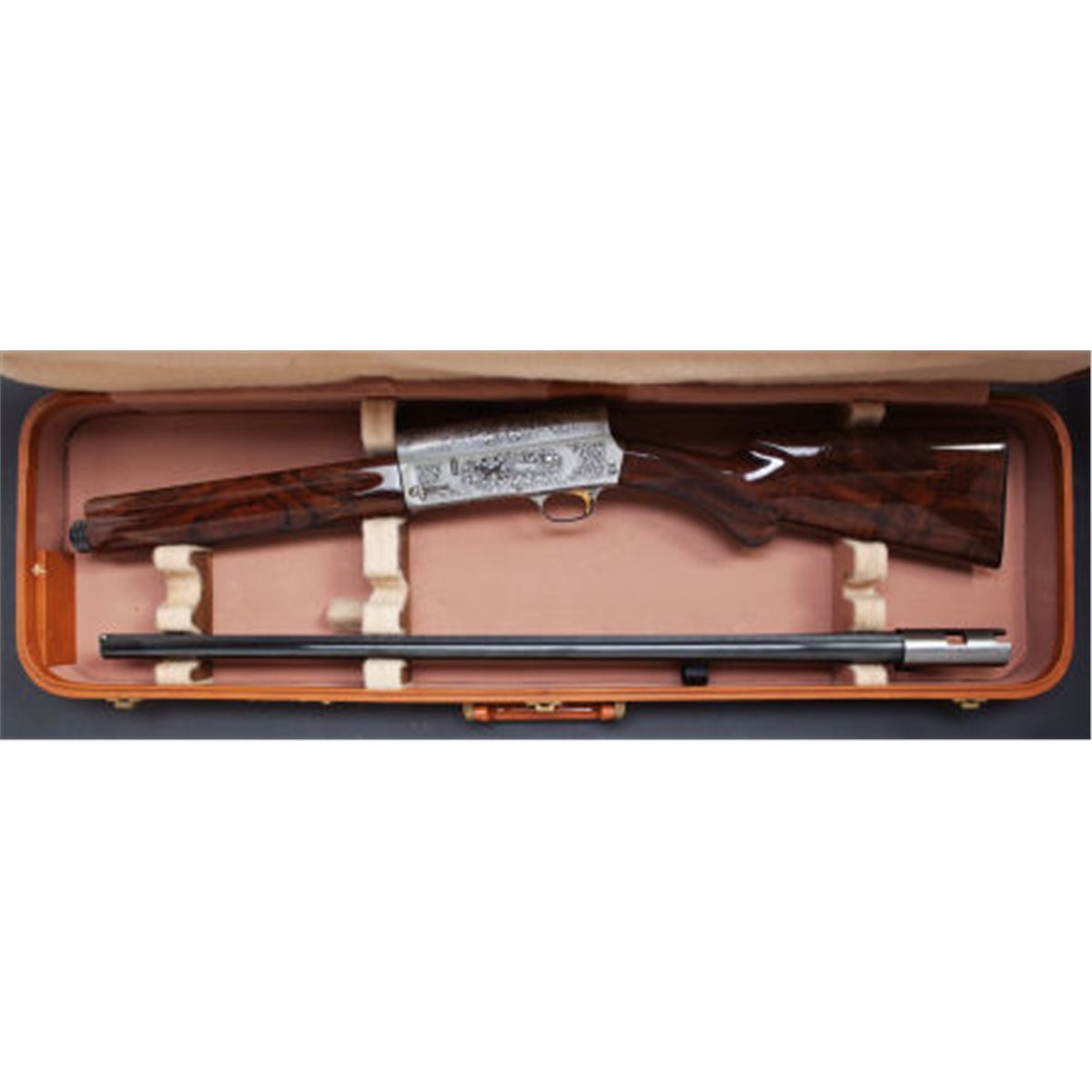 **Cased 12 Gauge Browning Classic One of 5000 A-5 Semiautomatic Shotgun. Serial no. 211BC0472. 12 Gauge. 28-inch barrel with ventilated rib. Insert choke. Silver gray action etched with floral designs and game scenes: Left side: Labrador after a fallen duck with banner: One of Five Thousand, right side: springing mallard with banner: Browning Classic with John Browning in oval and top: mallard in flight. Gold plated trigger. Finely checkered with beaded outline pistolgrip stock of well figured dark walnut. Round knob. Maker's buttplate. Finely checkered with beaded outline fore-end of well figured walnut. Maker's tan Naugahyde covered trunk case with fleece interior and brass hardware. Data: Choke: Insert. Chamber: 2 3/4 inches. Pull: 14 3/8 inches. Condition: Excellent, appears unfired. Stock shows a few light handling marks and a light impression and nick. Fore-end shows three small nicks.