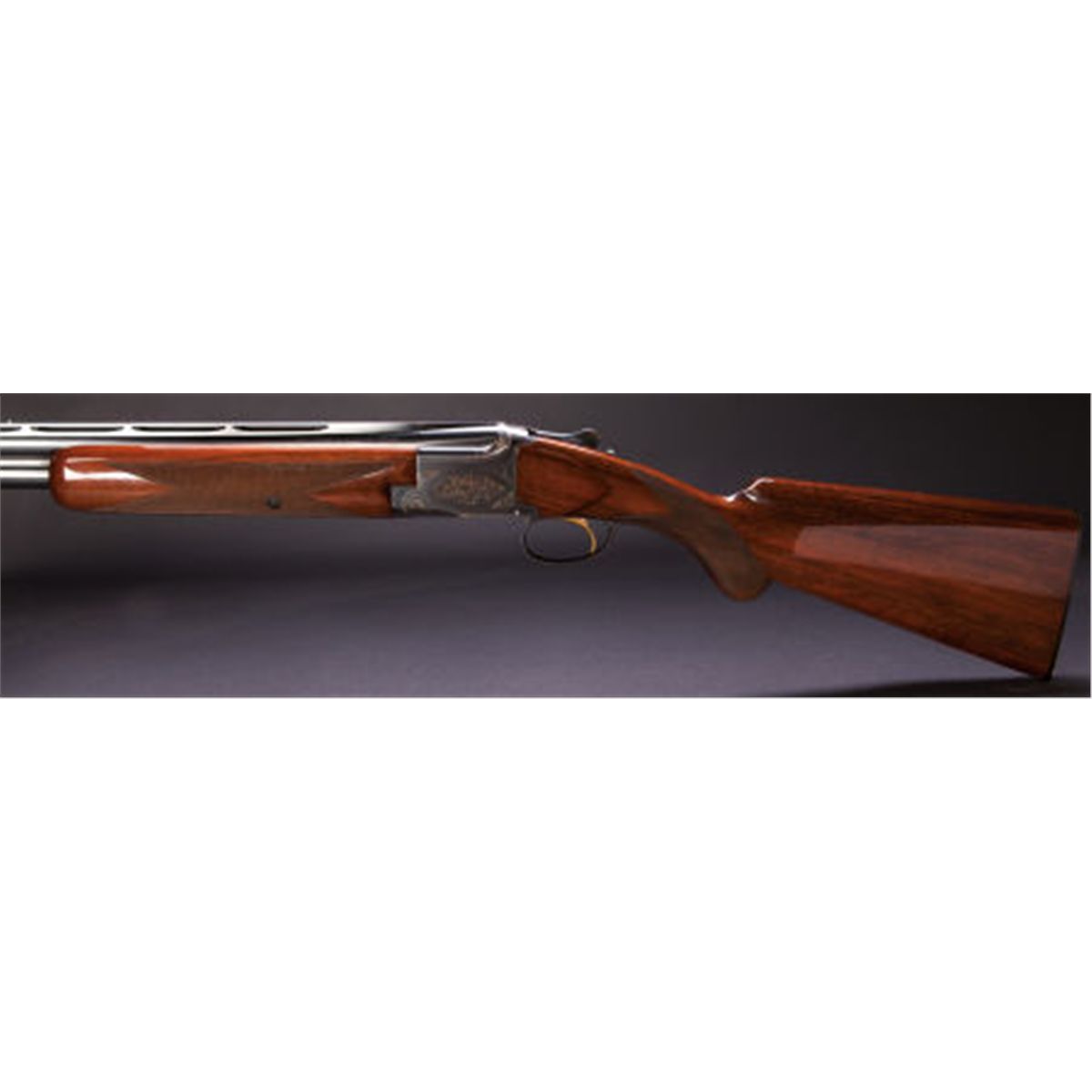 *Cased 12 Gauge Browning Lightning Superposed Broadway Skeet Shotgun. Serial no. 2836 S2. 12 gauge. 28-inch barrels with Broadway ventilated rib. Blued action engraved with stylized floral designs filled with gold. Ejectors. Non-automatic safety. Gold plated single selective trigger with shoe. Finely checkered pistolgrip stock with round knob and long tang. Maker's horn buttplate. Finely checkered standard fore-end Maker's brown Naugahyde covered trunk case with corrugated foam interior. Gun dates to 1962. Data: Barrel Dimensions: Bores: 0.727/0.730 inches. Chokes: 0.006/0.010 inches (Skeet 1/Skeet 2). Chambers: 2 3/4 inches. Stock Dimensions: Pull: 14 1/4 inches. Drop at comb: 1 1/2 inches. Drop at heel: 2 3/8 inches. Cast: None. Weight: 7 pounds, 12 ounces. Condition: Excellent: Barrels show 97-98% bluing with losses in front of the fore-end and a number of light marks on the side of the barrels. Excellent bright bores. Action shows 97-98% bluing with losses at lower edges. Triggerguard show 60-70% bluing with losses to tang. Marred tang screws slots. Stock and fore-end shows some light marks, and a very few nicks and impressions.