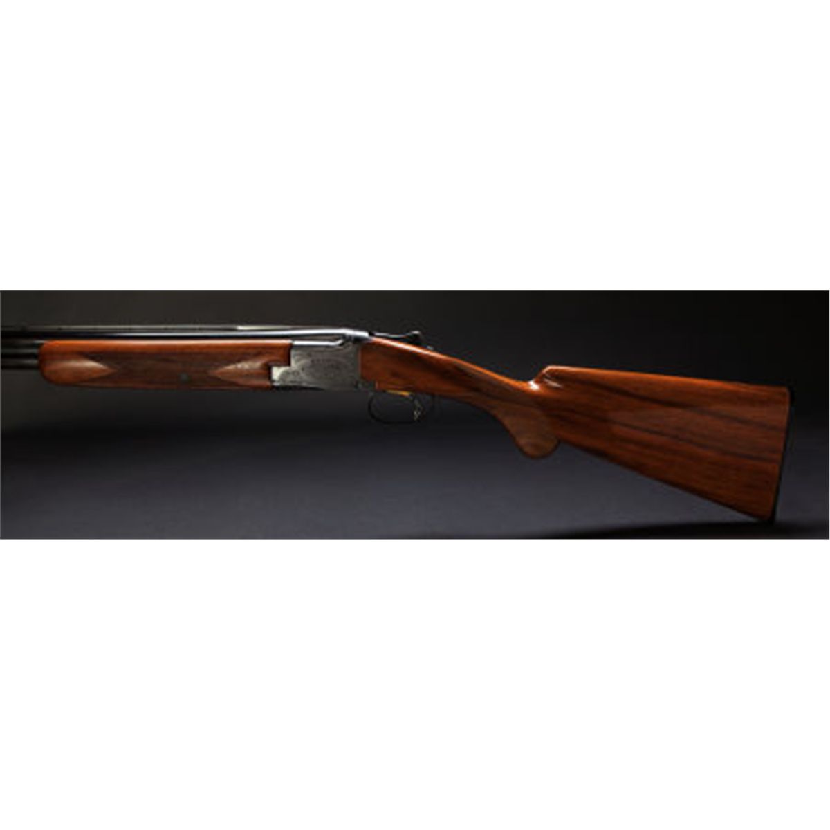 *Cased 20 Gauge Browning Lightning Grade 1 Superposed Shotgun 3 Barrel Set. Serial no. 18914. 20 gauge. Three 26 1/2-inch barrels with ventilated rib, each set of barrels numbered to the gun. Double beads. Barrels marked with: 20 ga shells 2 3/4 "; and 3";. Blued action engraved with stylized floral designs. Ejectors. Non-automatic safety. Gold plated single selective trigger with shoe. Finely checkered pistolgrip stock with round knob and long tang. Maker's plastic buttplate. Finely checkered standard fore-end for each set of barrels. Maker's brown Naugahyde covered three barrel trunk case with fleece interior. Owner's manual and extra buttplate. Set dates to 1960. Data: Barrel Dimensions: No. 1 barrels: Bores: 0.616/0.612 inches. Chokes: 0.022/0.011 inches (Improved Modified/Modified). Chambers: 3 inches. No. 2 barrels: Bores: 0.612/0.610 inches. Chokes: 0.036/0.017 inches (Full/Improved Modified). Chambers: 3 inches. No. 3 barrels: Bores: 0.612/0.612 inches. Chokes: 0.010/0.010 inches (Improved Cylinder). Chambers: 3 inches. Stock Dimensions: Pull: 14 1/4 inches. Drop at comb: 1 3/8 inches. Drop at heel: 2 1/8 inches. Cast: None. Weight: 6 pounds, 5 ounces. Condition: Excellent, showing limited use. No. 1 barrels: Barrels show 99% bluing with a slight 1/2 inch scratch to finish in front of fore-end. Excellent bright bores. Fore-end shows two small impressions and some slight marks. No. 2 barrels: Barrels show 98-99% bluing with slight 1/2 inch scratches to finish in front of fore-end. Excellent bright bores. Fore-end shows a few light impressions and marks. No. 3 barrels: Barrels show 97-98% bluing with some losses in front of fore-end. Excellent bright bores. Fore-end shows some very light to light marks. Action shows 96-98% bluing with losses under safety. Stock shows some light marks and a few light impressions. Case in excellent condition, with impressions from barrels on inside of lid and at pressure points on interior.
