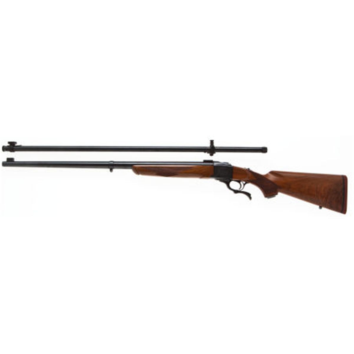 **Cased 45-70 Ruger/Lyman Centennial 1878 Edition II Rifle and Telescopic Sight Set. Serial no. L-78 0465. 45-70 Govt. 28-inch heavy barrel with scope blocks for full length telescopic sight. No open sights. Ruger No. 1 blued action photo engraved with fine foliate scroll and Lyman detailed medallions. Finely checkered pistolgrip stock of semi-figured walnut. Maker's recoil pad and steel grip cap. Finely checkered schnable fore-end. Sling eyes. Blued 34-inch ¾ inch diameter period telescopic sight with external adjustments. End caps. Cross hairs. Walnut trunk case with green felt interior with maker's label. Accessories include: cleaning rod, box of cartridge cases, commemorative coin and Lyman Centennial Journal. Missing loading tool and some coins. Condition: Excellent, barrel shows 98% bluing with a few marks. Action shows a ½ inch light scratch. Excellent bore. Stock shows a 1-inch repaired scratch and a few light marks. Telescopic sight: Fine. Shows 96-98% bluing with scratches and losses at the rear mount. Clear optics. Case in Very Good condition. Lid shows a number of nicks and scratches. Frame is opening on back corners. Interior portions show some breaks and looseness. Interior shows impressions.