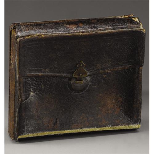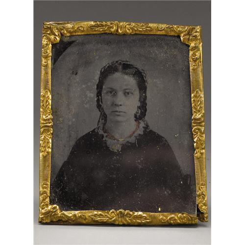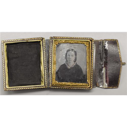<B>Cased Ambrotype of Confederate Surgeon Major Samuel Houston Caldwell's Wife Mary- Carried By Him Throughout the War.</B></I> This 1/9th plate ambrotype of Mary Thompson Caldwell was carried in this elaborate leather case by Confederate Surgeon Major Samuel Houston Caldwell throughout the Civil War. Caldwell rode with the famed Confederate cavalryman General Nathan Bedford Forrest and wrote many letters home to his beloved wife back in Paris, Tennessee. <BR><BR>A copy of a Tiptonville newspaper concerning his letters is included with this ambrotype. In the letters he writes about the siege at Island Number 10 on the Mississippi. He also tells of camp life and of how homesick he is for Paris, Tennessee and his wife and of how he cannot take leave until “they have this fight at New Madrid” referring to a nearby town where the Confederates would eventually fight before retreating to Island Number 10 where they were captured. He misses his wife so much that, in one of his letters published in the newspaper, he writes that if it were not for his wife to come home to, “I would not care much if one of Abe's balls did get me”. <BR><BR>This photograph survived the war as did Caldwell who returned to his home to build a family and a medical practice. He remained active in Confederate reunion groups, collecting mementoes from the war and elaborate reunion medals and printed programs of the events. This cased photograph of his wife was one of his most treasured possessions. It is in excellent condition with its leather case that folds out to reveal the well-protected photograph, complete with its functional metal clasp.<BR><BR><b>Shipping:</b> Miscellaneous Collectibles, Smal (<a target="_blank" href="http://www.heritageauctions.com/common/shipping.php">view shipping information</a>)