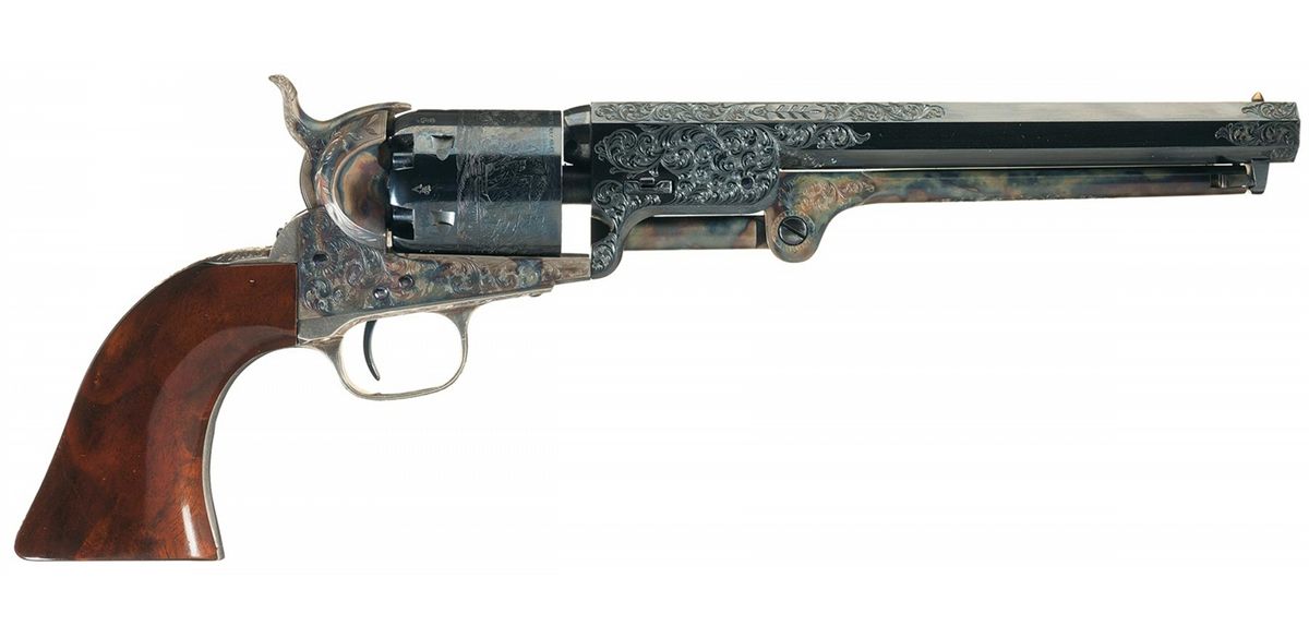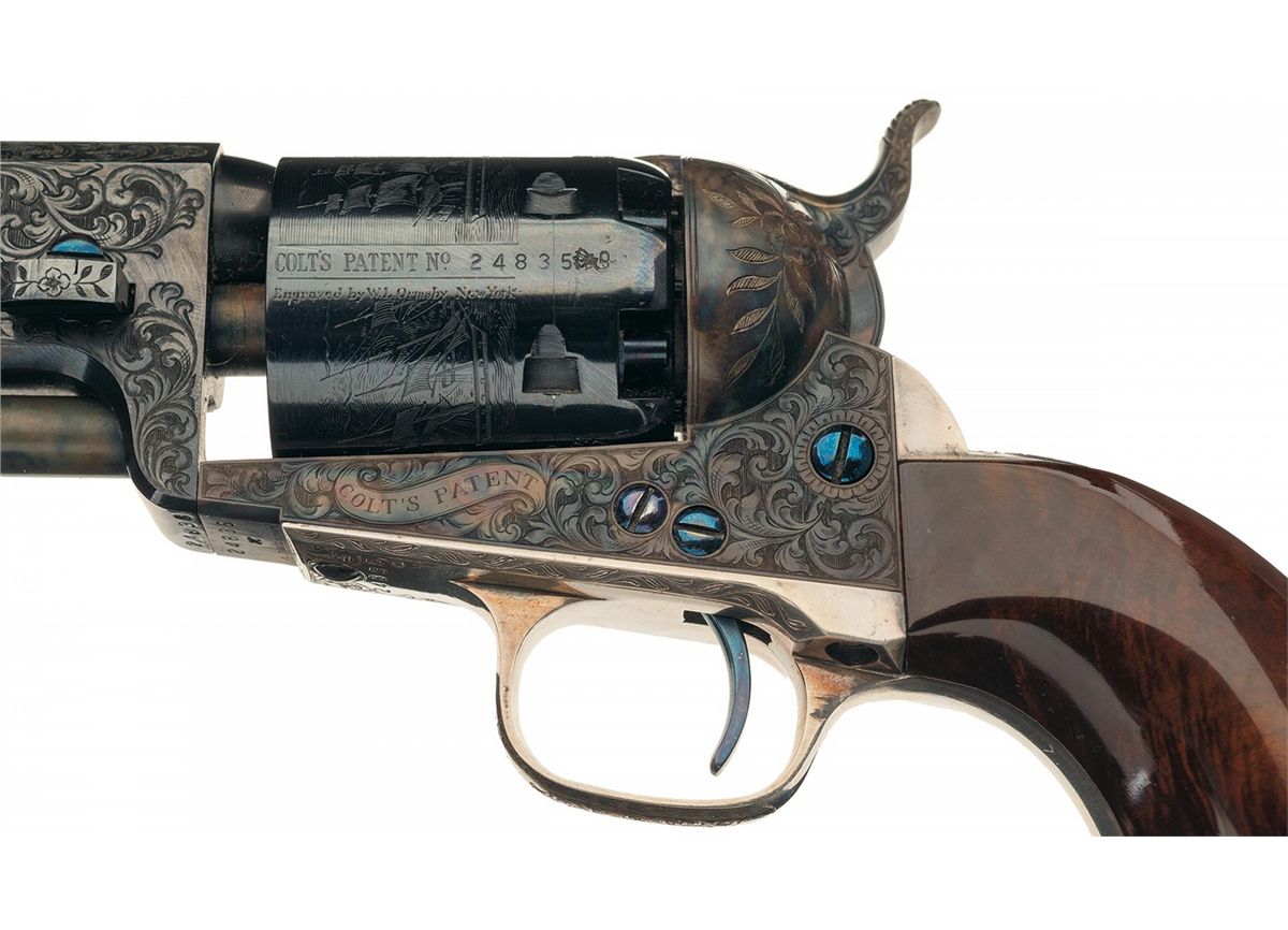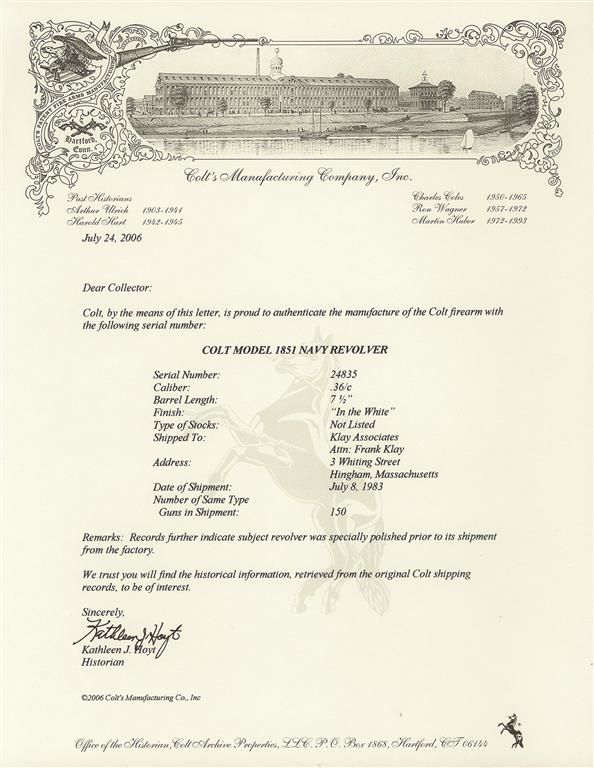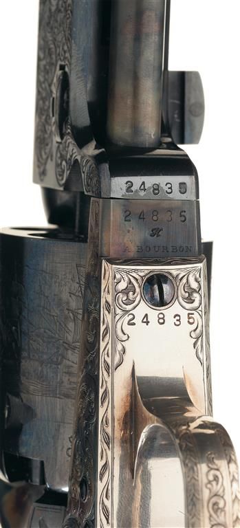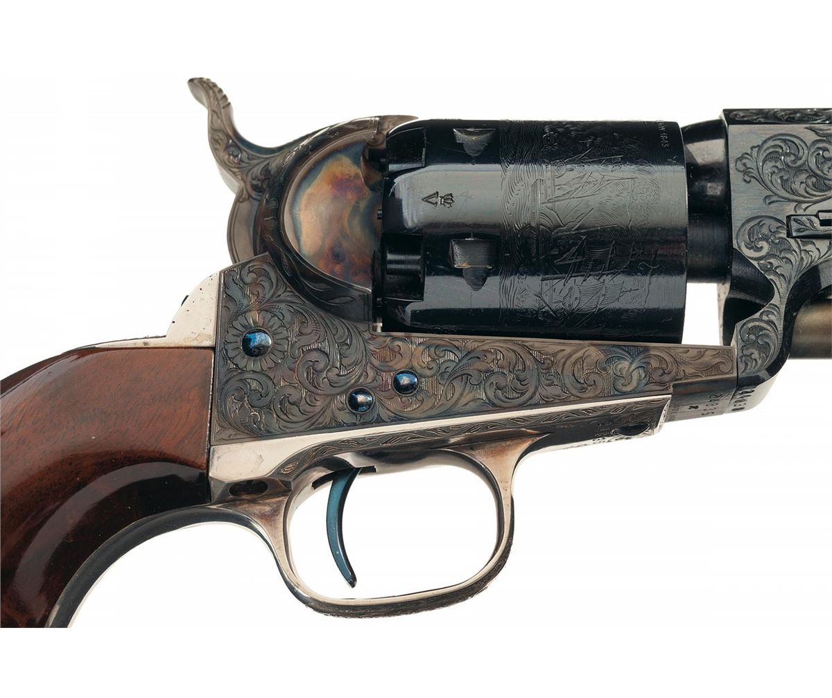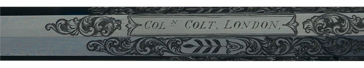 This example was masterfully engraved with floral scroll engraving by Andrew Bourbon. Andrew Bourbon apprenticed under Alvin A. White. The floral scroll engraving is present on the muzzle end of the barrel, the rear section of the barrel, the barrel lug, the bottom and flat sides of the loading lever, the frame, the hammer, the trigger guard, the butt and the back strap. The top of the barrel is engraved "COL n COLT, LONDON,", there are two British proofs on the left side of the barrel lug and there are "crown/V" proofs between the nipples on the cylinder. Fitted with a beautifully figured smooth walnut one piece grip with piano style finish. The factory letter states that this revolver was shipped In the White, the type of stocks as "Not Listed", that it was shipped to Klay Associates on July 8th, 1983 and that 150 guns were in the shipment. With an oak display case, an early Colt box numbered to another gun, a cleaning rod, an oiler bottle, a powder flask, a bullet mold, an empty cap tin and a screwdriver/nipple wrench.