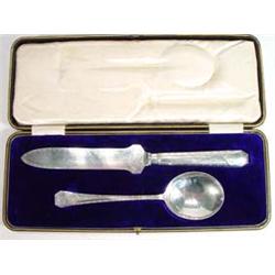 Cased Arts and Crafts silver plated knife and spoon with riveted handle and line and dot punched …
