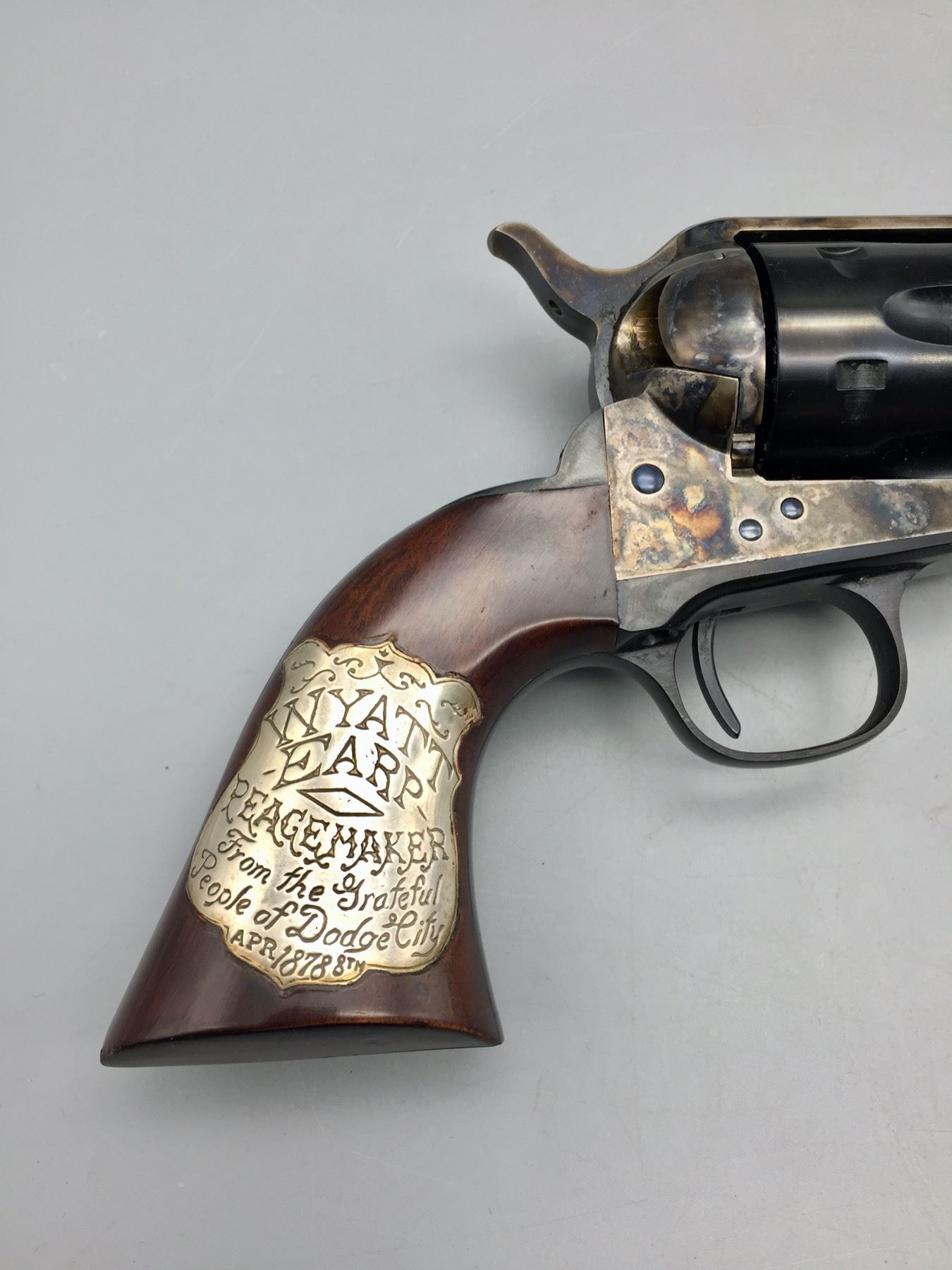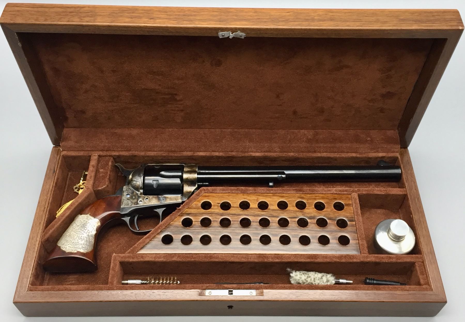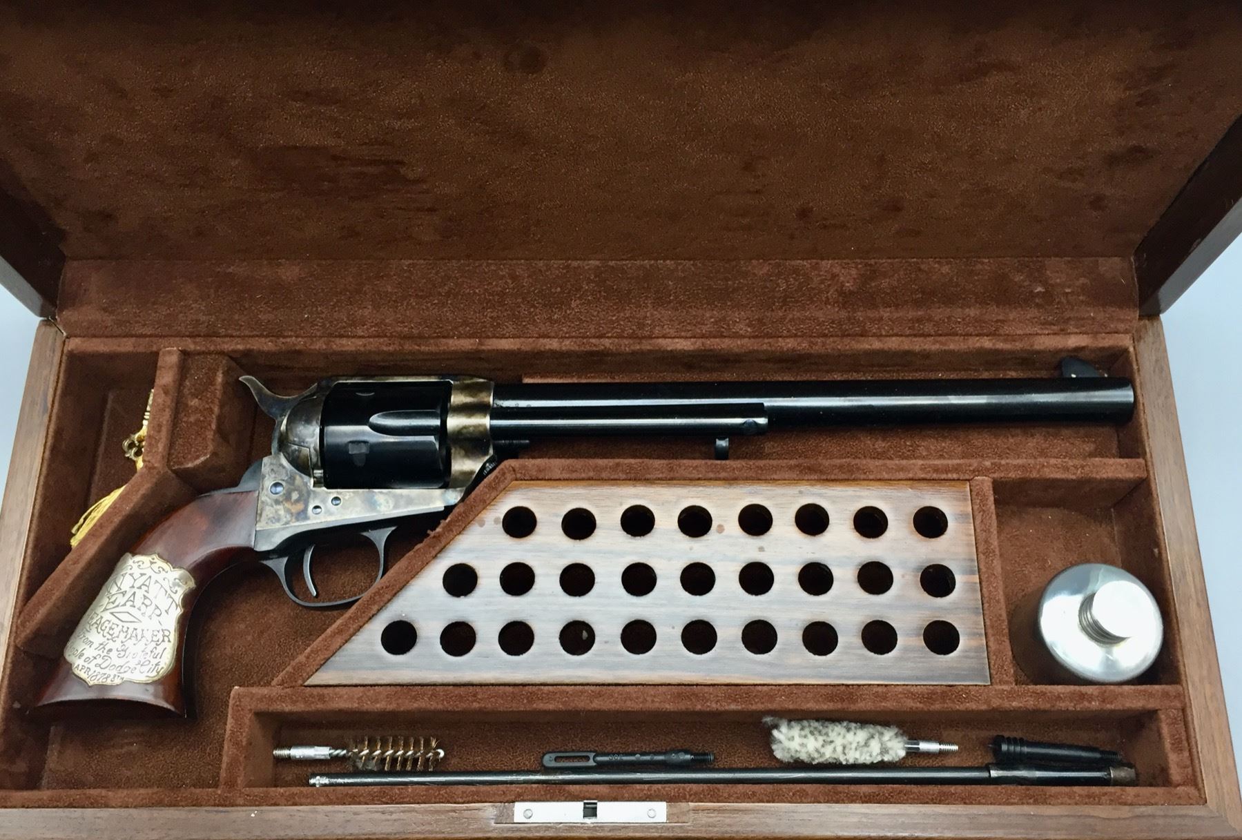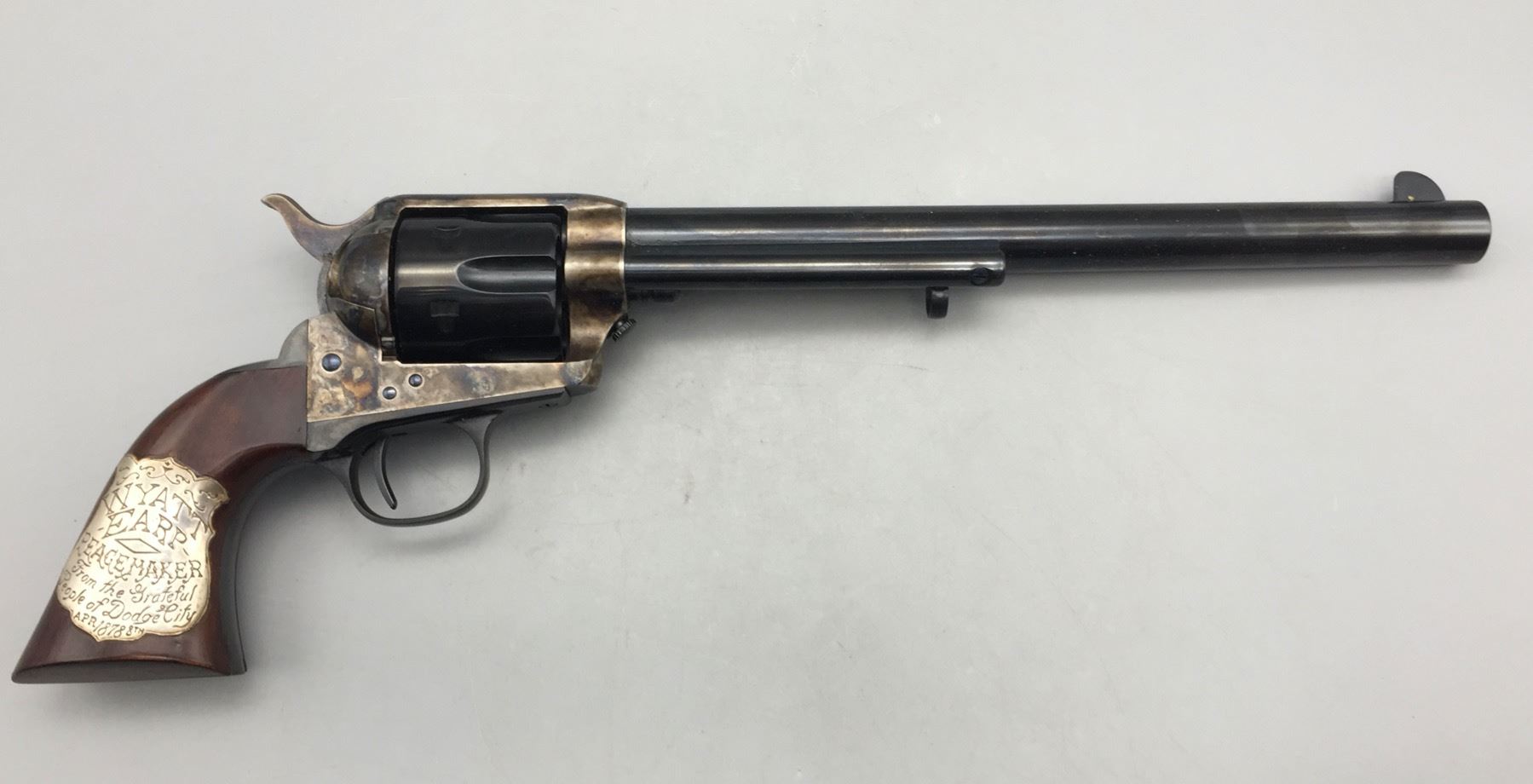 Description: Included for sale in this lot is a cased Buntline Special in a .45 caliber with an engraved plate that reads Wyatt Earp, Peacemaker, from the grateful people of Dodge City, April 1878. It comes with various accessories in a nice presentation box. Maker: Cimarron Arms. Approx. Age: Modern, Serial No. 1572. Size: 10 inch barrel. Box measures 16-3/4 inches x 7-1/2 inches x 3 inches deep. Condition: Good. Please look closely at the pictures - they are an important part of our description. Shipping: There will be a $15 handling, packaging fee for shipping this lot. The actual cost of postage will be added on top of that. *****This firearm requires an FFL Transfer*****
