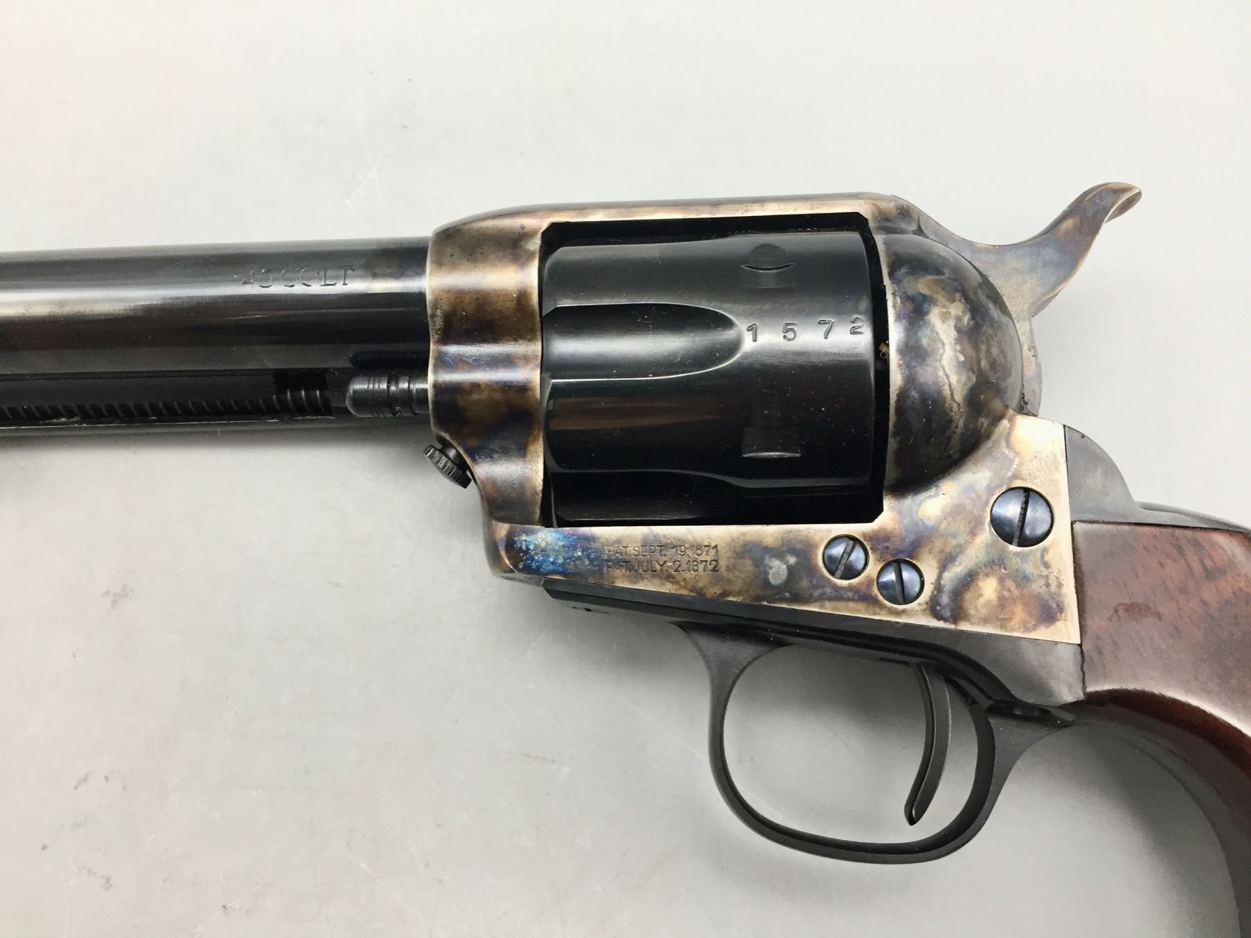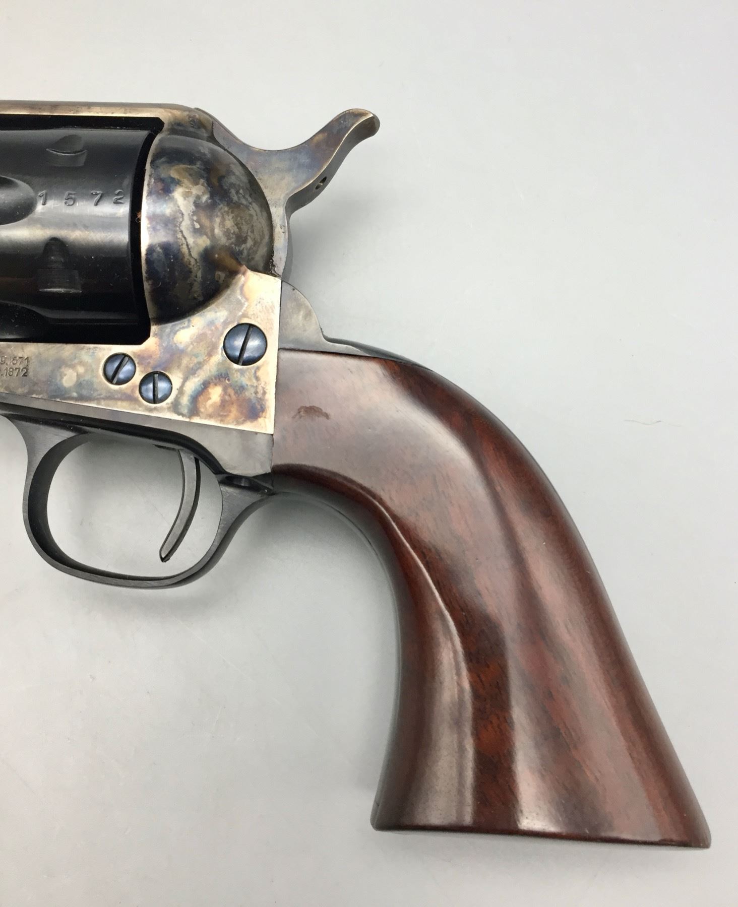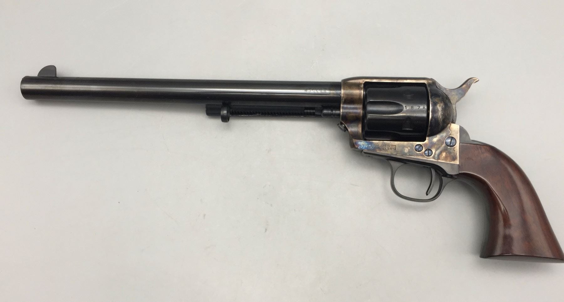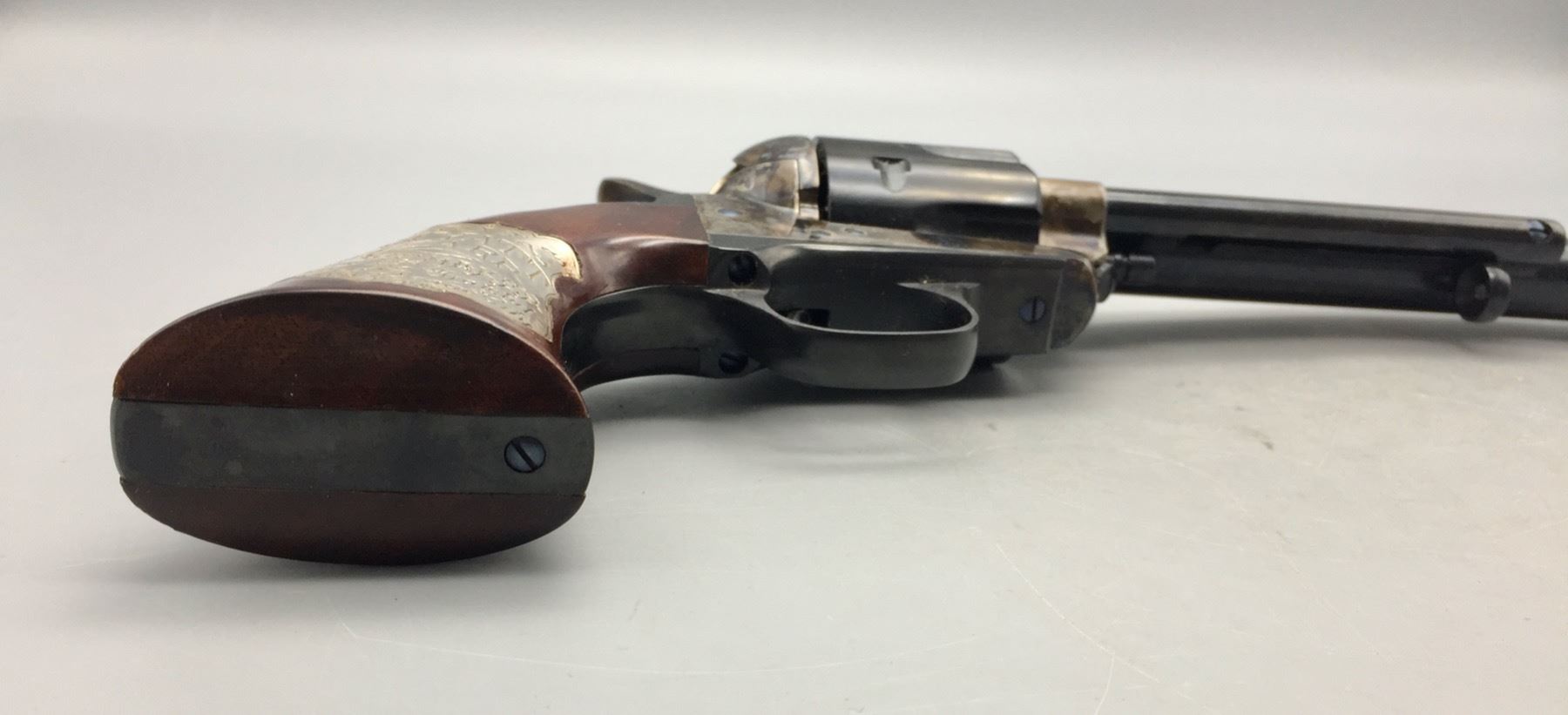 Description: Included for sale in this lot is a cased Buntline Special in a .45 caliber with an engraved plate that reads Wyatt Earp, Peacemaker, from the grateful people of Dodge City, April 1878. It comes with various accessories in a nice presentation box. Maker: Cimarron Arms. Approx. Age: Modern, Serial No. 1572. Size: 10 inch barrel. Box measures 16-3/4 inches x 7-1/2 inches x 3 inches deep. Condition: Good. Please look closely at the pictures - they are an important part of our description. Shipping: There will be a $15 handling, packaging fee for shipping this lot. The actual cost of postage will be added on top of that. *****This firearm requires an FFL Transfer*****