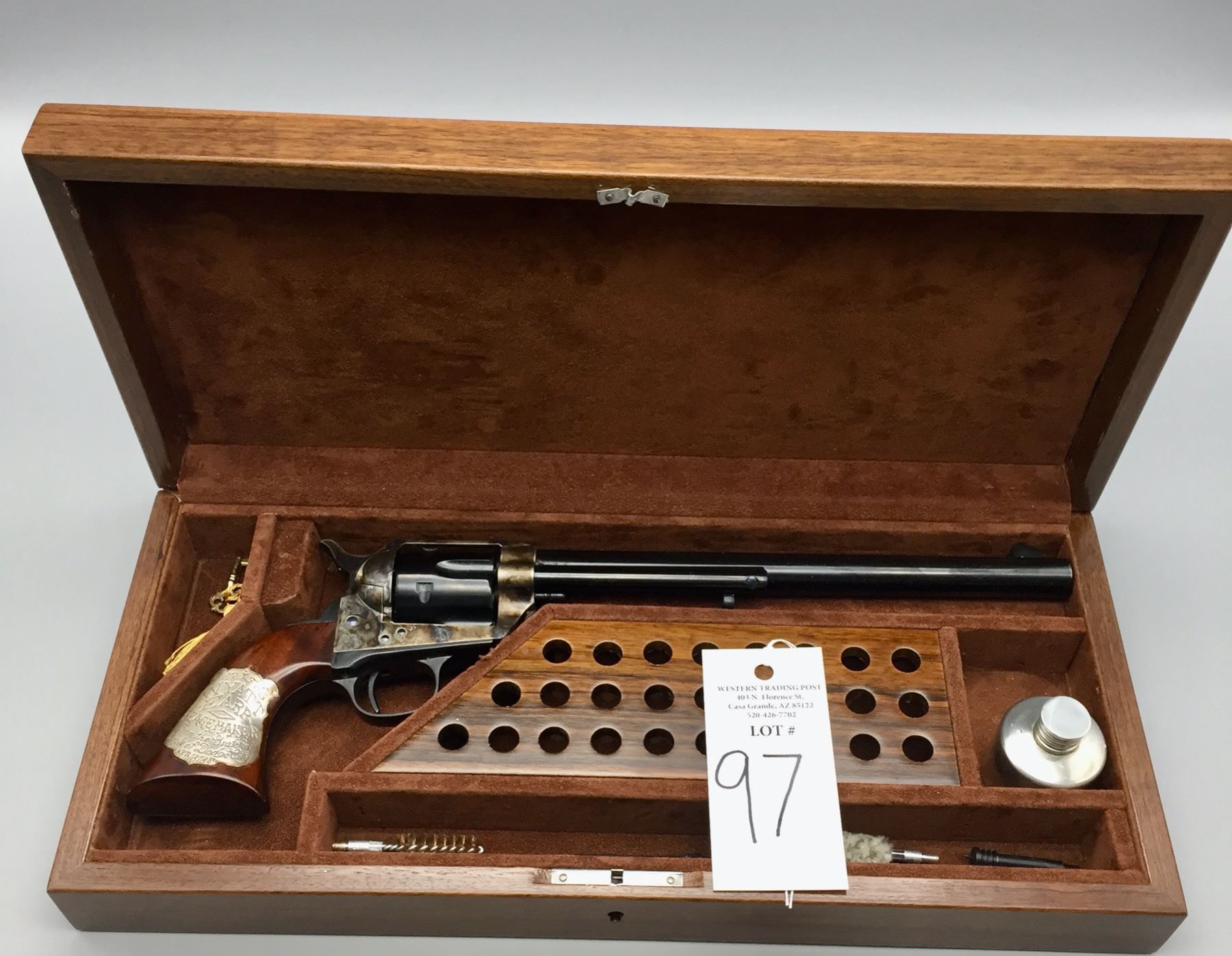 Firearms: Any person(s) bidding on firearms in our auction are required to be at least 18 years of age for long guns and 21 years of age for hand guns. Western Trading Post llc. is a licensed Federal Firearms Licensed (FFL) dealer. Any Bidders who desire to bid on and purchase any firearms in our auctions cannot have been convicted of a felony, have any restraining orders, or have any reason that they would not pass a NICS FFL background check. Western Trading Post llc. reserves the right to run a NICS FFL Background check on any purchaser of firearms. If the Bidder is a resident of the state of Arizona, they may pick up in person once cleared by the NICS FFL background check. Otherwise, firearms will be shipped to a Federal Firearm Licensed Dealer of your choosing nearest your residence. The Buyer agrees to pay for any and all shipping/handling/fees/etc. necessary for the shipping and transfer of firearms. Antique firearms and black powder replicas which are exempted from NICS FFL background checks can be transferred directly to the purchaser (where not prohibited).