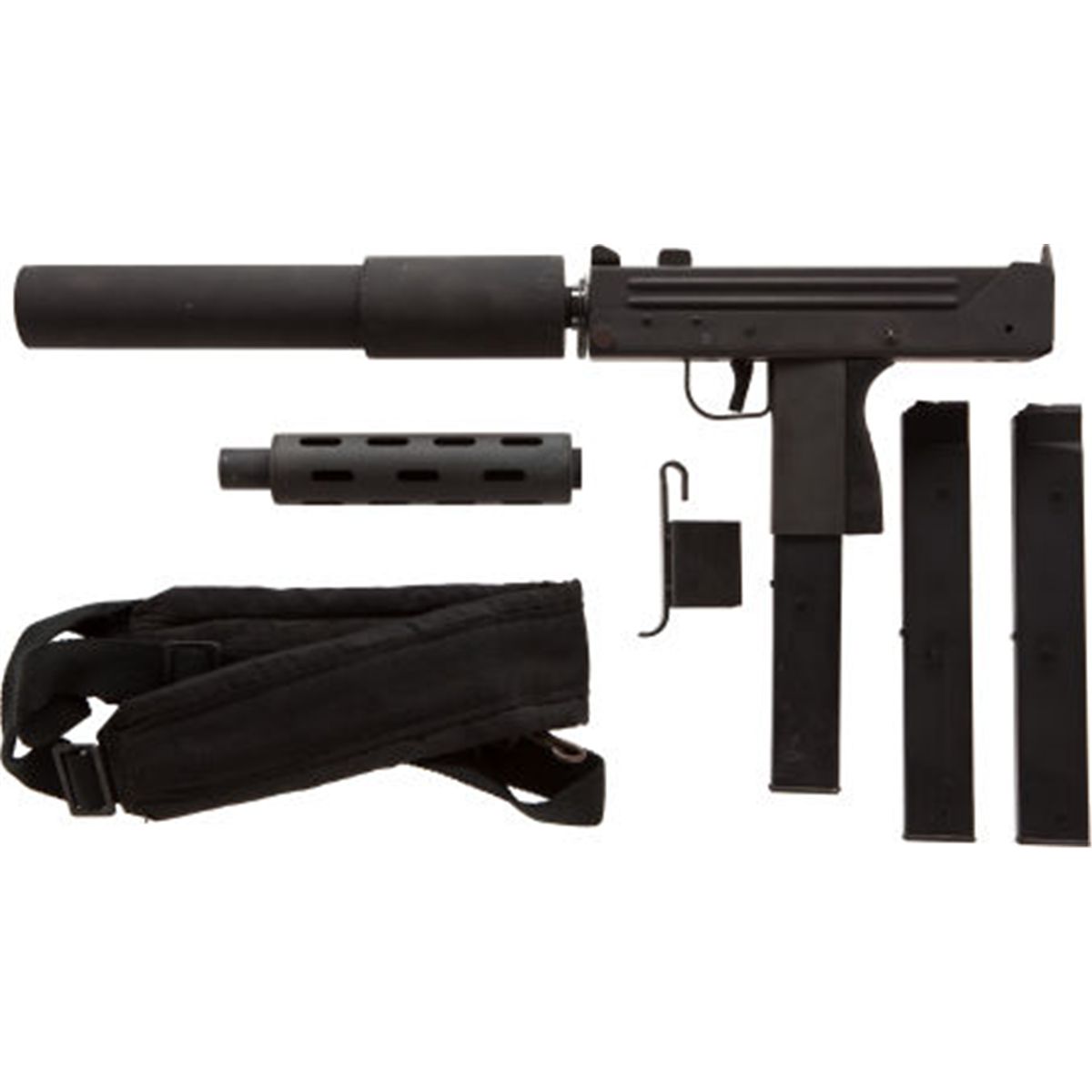 Cased Cobray Model 11-9 Semi-Automatic Pistol. Serial no. 85-0003385, 9MM, 4-inch barrel. Sold together with three magazines, dummy suppressor and barrel heat shield. Condition: Excellent. NRA FIREARMS FOR FREEDOM PROGRAM