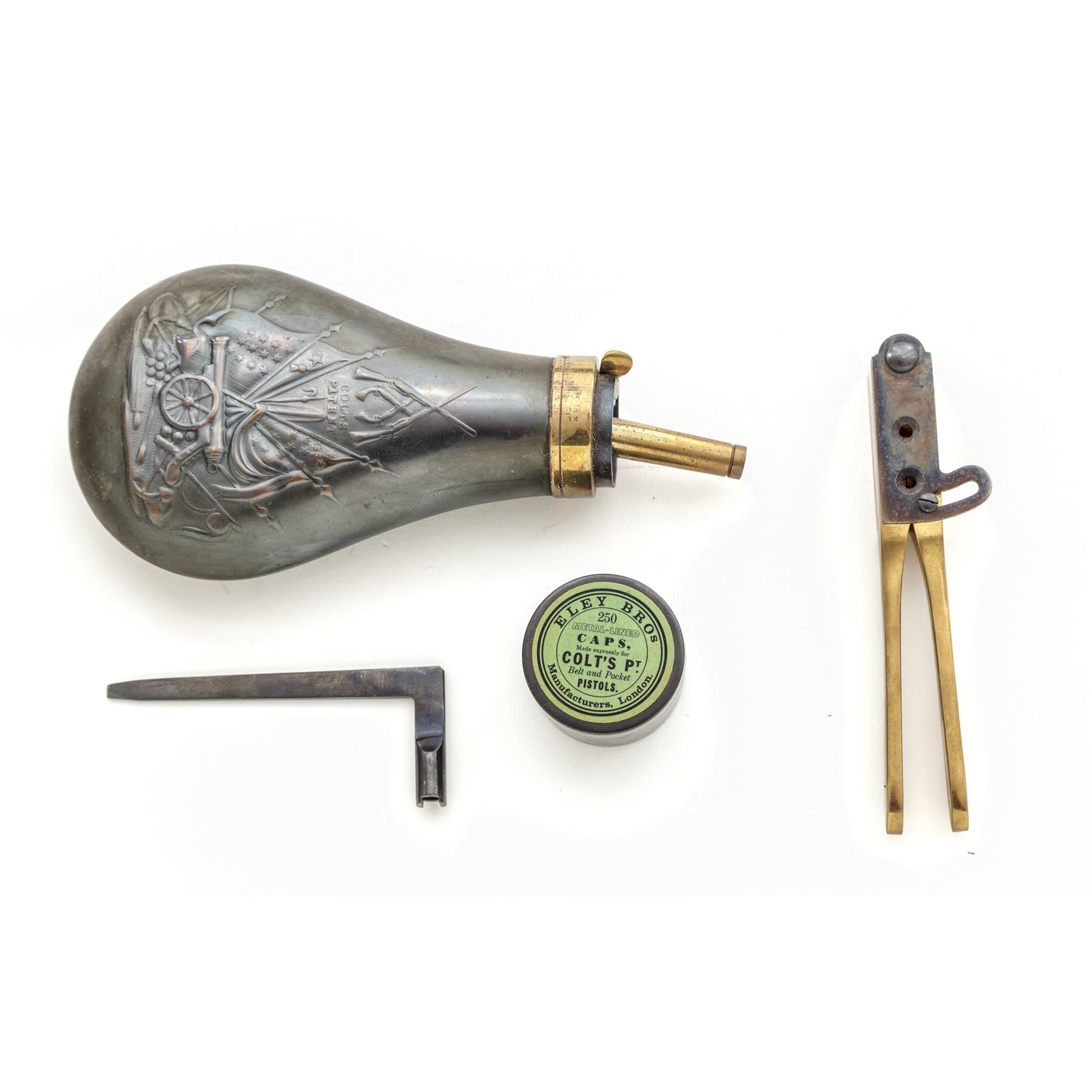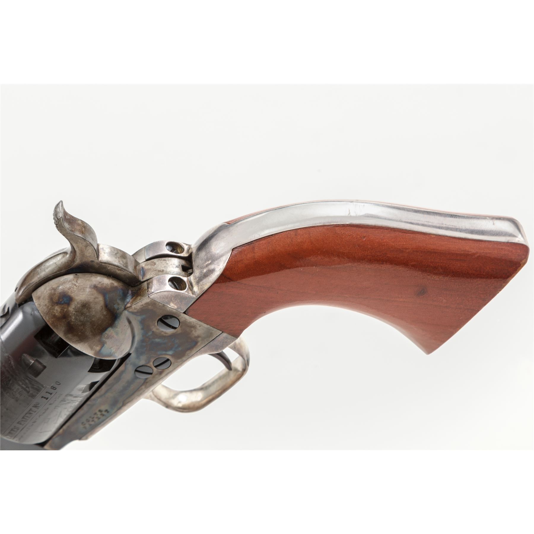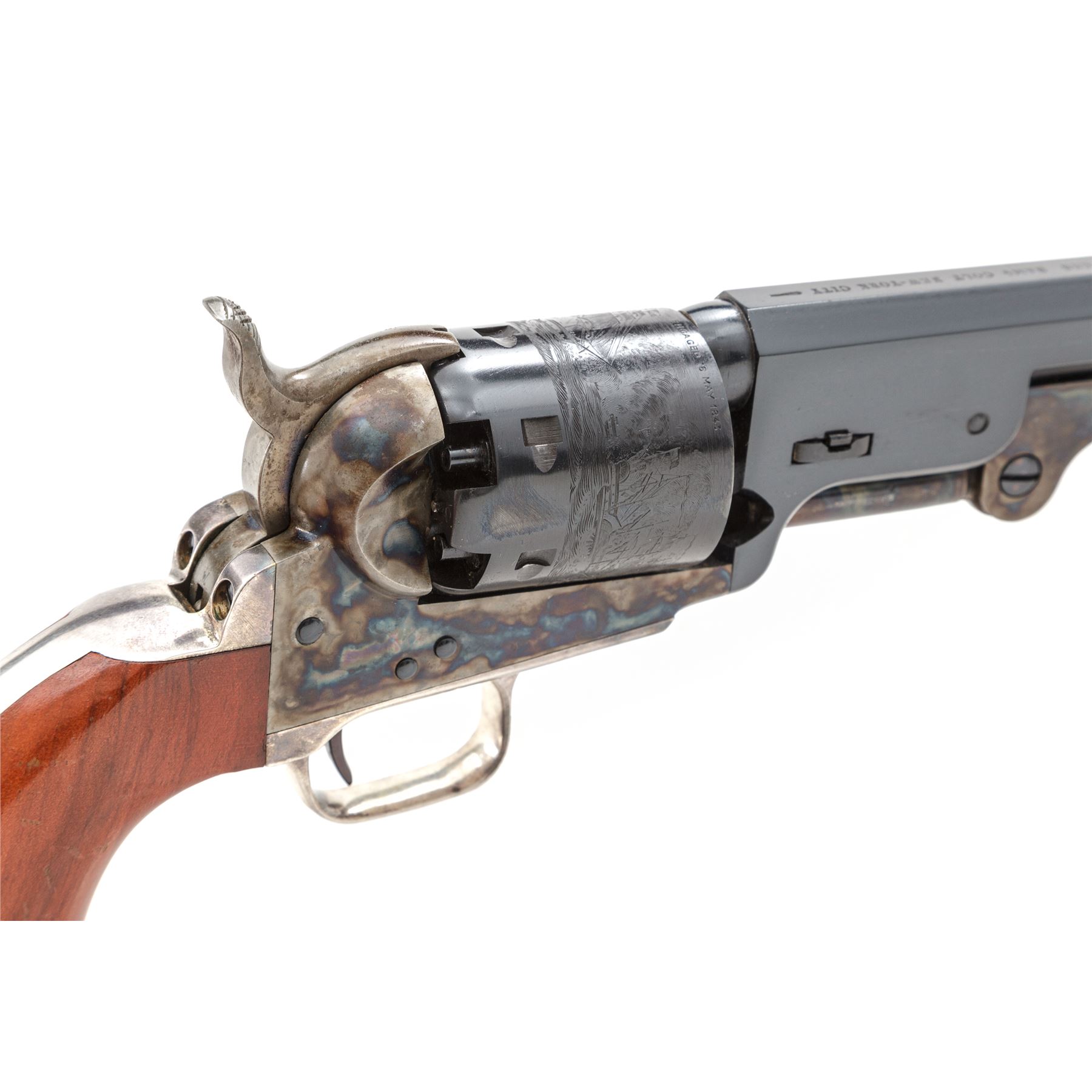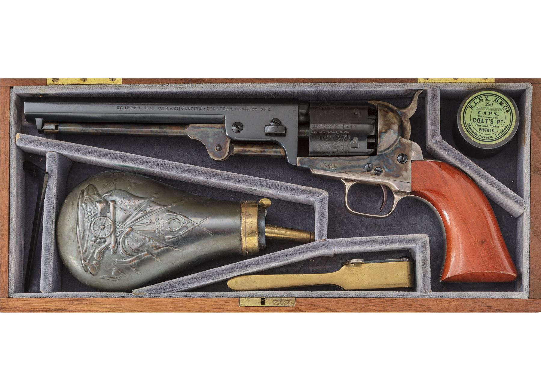 Colt 2nd Generation ''Robert E. Lee Commemorative'' Model 1851 Navy Percussion Revolver, with wood case and accessories, #1180, .36 cal., 7.5'' octagonal barrel marked on top flat ''-Address Saml Colt New-York City-'', and ''Robert E. Lee Commemorative - Nineteen Seventy One'' on left flat (and on case); round 6-shot cylinder is roll engraved with naval battle scene and marked ''Colt's Patent No. 1180 /Engraved by W.L. Ormsby, New York'' in two lines parallel to bores and ''Engaged 16 May 1843'' in tiny letters along its front circumference; case hardened frame is marked ''Colts/Patent'' in two lines on left side; case hardened hammer, lever and plunger; silver-plated brass backstrap and loop triggerguard; one-piece varnished walnut grips. Condition is excellent and unfired, retaining 100% original blued finish, brilliant case colors, silver with a soft patina, and fine grips with most original vanish showing minor handling marks and wear at bottom edges. Action is crisp; bore shows brilliant blue with deep rifling. Mahogany case retains all of its soft oil-stained finish with a brass ''Colt'' logo medallion inlay; case bottom is lined in gray velveteen and compartmented for the pistol, a copper and brass powder flask, brass bullet mold, Eley Bros. cap tin with green label, and nipple wrench-screwdriver, all in fine to excellent condition. Now almost a half-century old, these early Colt commemoratives are scarce and quite desirable. Est.: $500-$750. (No FFL Required)