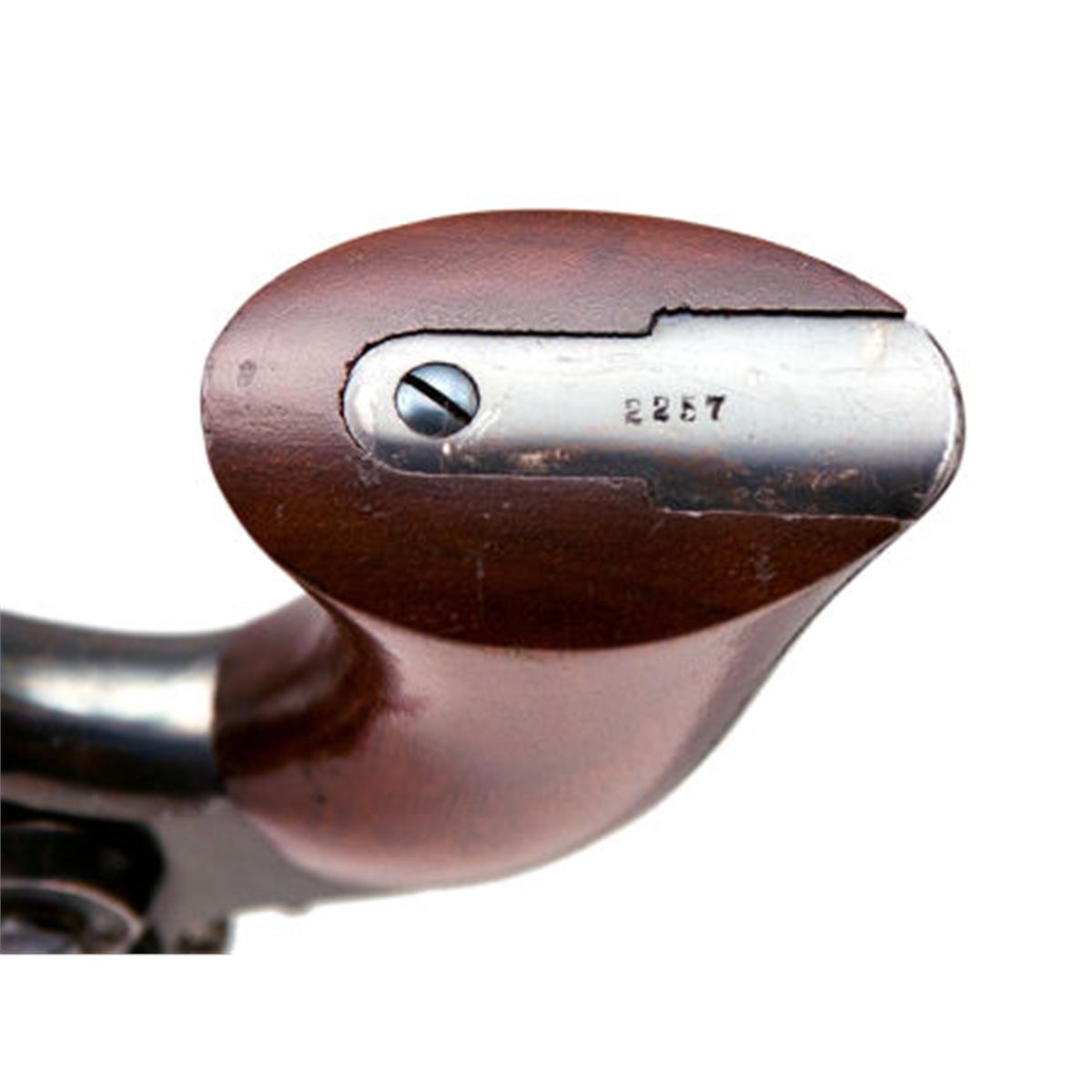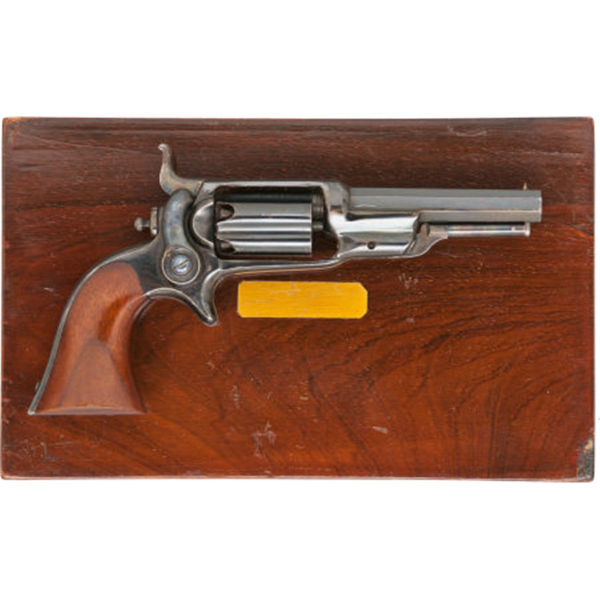 Cased Colt 4th Model 1855 Root Percussion Pocket Revolver with Accessories. Serial no. 2257, .31 caliber, 3 ½-inch octagonal barrel with two-line Hartford address. Blued finish. Case-hardened lever and hammer. 5-shot fluted cylinder. Spur trigger. Varnished one-piece walnut grip. Contained in keyed original factory deep green velvet-lined partitioned rosewood case together with the following accessories: eagle on hummock powder flask with no Colt's patent; Colt cartridge works packet of .31 caliber skin cartridges with pull wire intact; straight-leg two-cavity Colt's Patent .31 caliber bullet mold; flat screwdriver/spacer tool and 100 capacity green label Eley cap tin with 95% of the label. Case with vacant brass escutcheon on lid. For the advanced Colt collector who appreciates true rarity.Condition: Excellent to mint. Retaining approximately 99% original blue finish with fully vibrant case colors on rammer and hammer. Mint varnished walnut grip. Action crisp. Case with light wear and minor chip to veneer on lower right corner. Accessories excellent to mint.