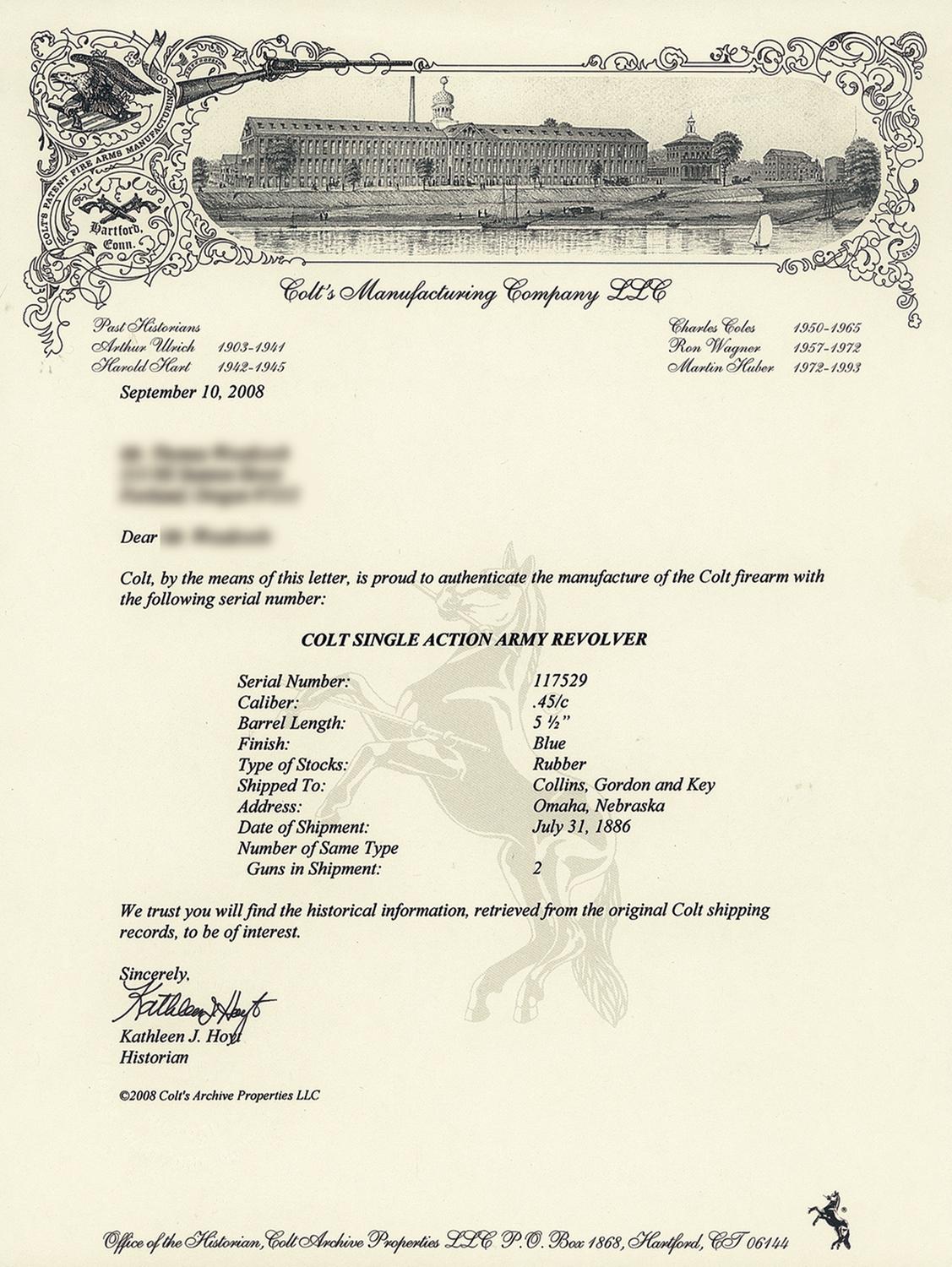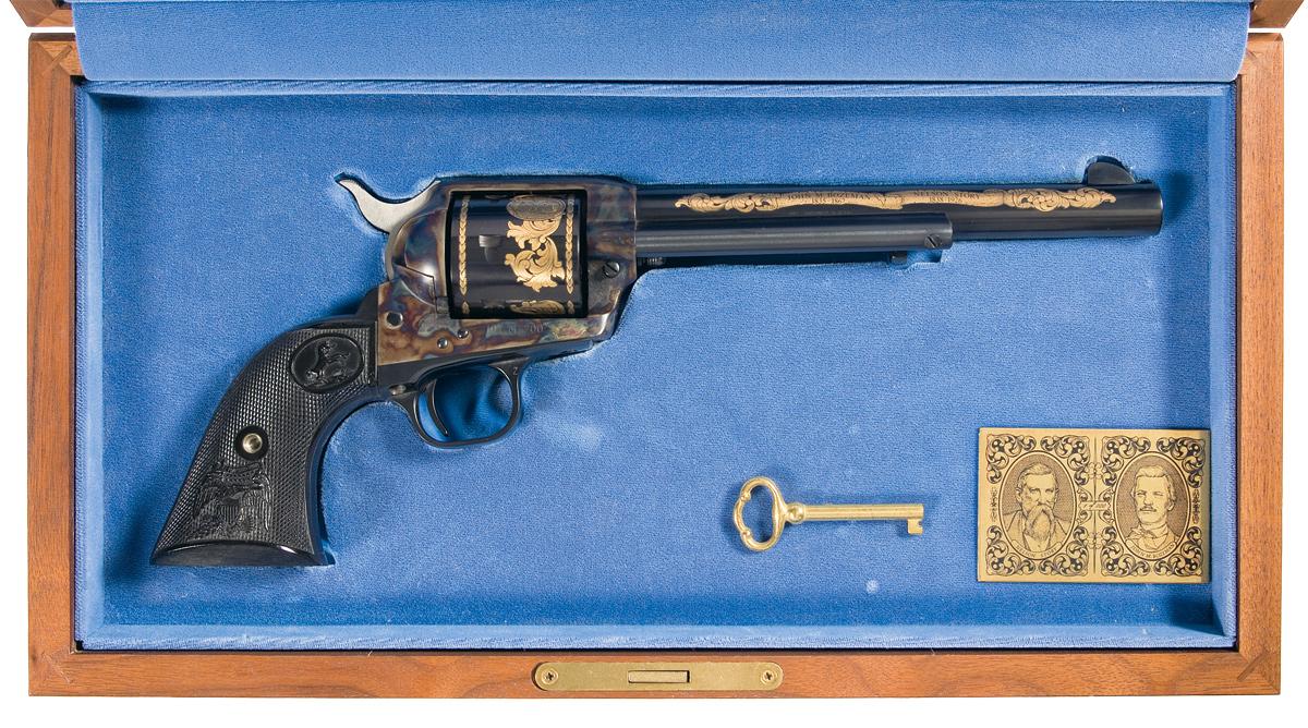 This Colt Single Action revolver is a Limited Edition of only 200 commemoratives of the Bozeman Trail. The right side of the frame is marked "107 of 200". Standard barrel and frame markings, blade front and frame notch rear sights and fitted with two piece checkered Rampant Colt, American Eagle grips. Complete in a walnut presentation case with powder blue velvet lining, commemorative plaque and key. The accompanying factory letter verifies the above information and that it was shipped to Powder Horn Sportsman Supply, Bozeman, Montana on January 19, 1983.