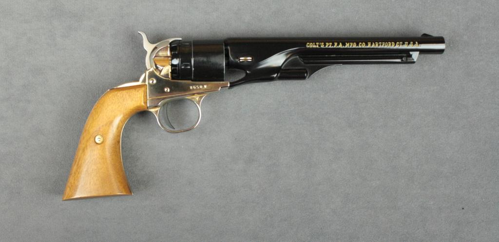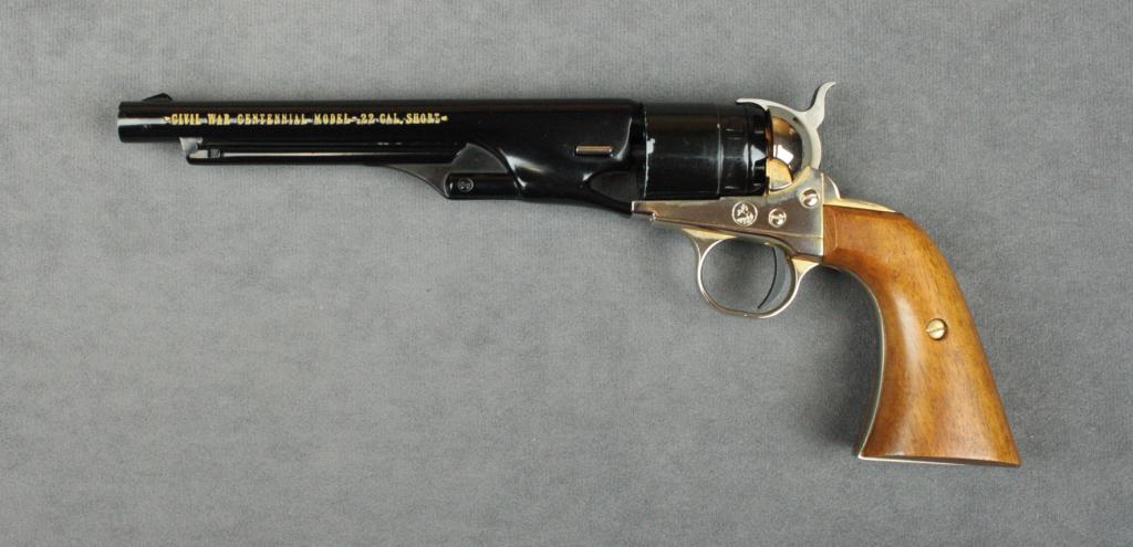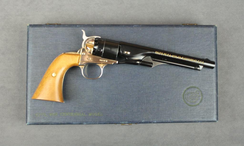 Cased Colt Civil War Centennial Model Commemorative gun, .22 short cal., single shot that is designed like a diminutive Colt Model 1860 Army revolver, 6” barrel, blue and gold finish, wood grips, #8650W. This gun is in overall excellent condition showing just a couple of slight losses to the finish confined primarily to the front of the cylinder, fine grips; box is in overall very good condition. Est.: $150-$300.
