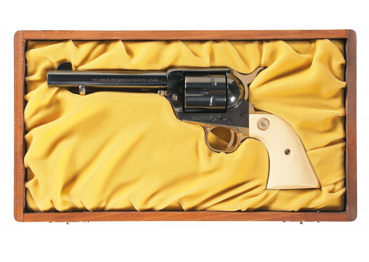 Standard markings and features. Matching serial number on frame and left side of grip straps under the grip and fitted with ivory grips. Complete with Colt wood case.