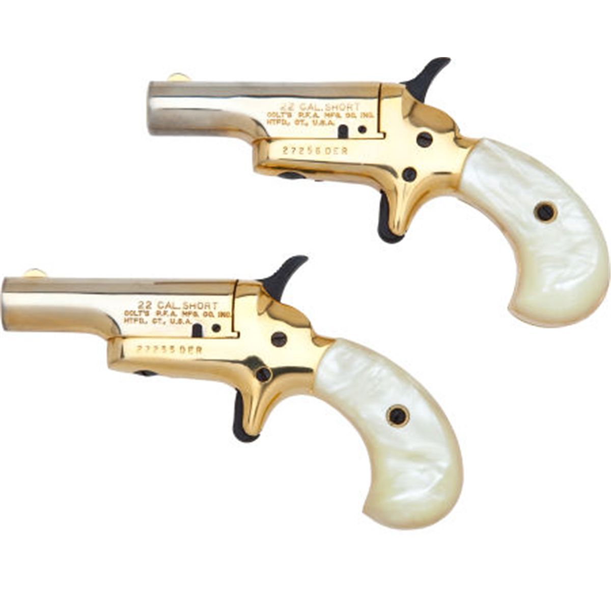 Cased Colt Lady Deringer Set. Serial nos. 27255DER & 27256DER, .22 caliber, 2 1/2-inch brass barrels. Brass frames with spur triggers. Faux pearl bird's head grips. Both contained in original grey velvet-lined factory case with pictorial lid and rampant Colt logo inside lid. Condition: Excellent. NRA FIREARMS FOR FREEDOM PROGRAM
