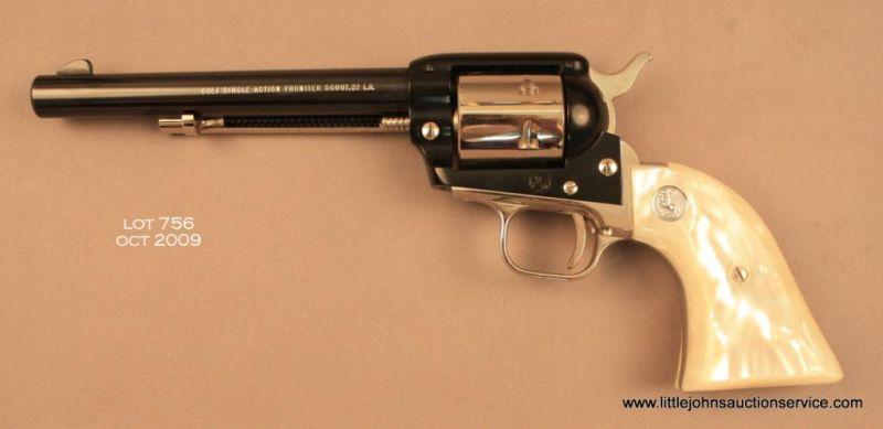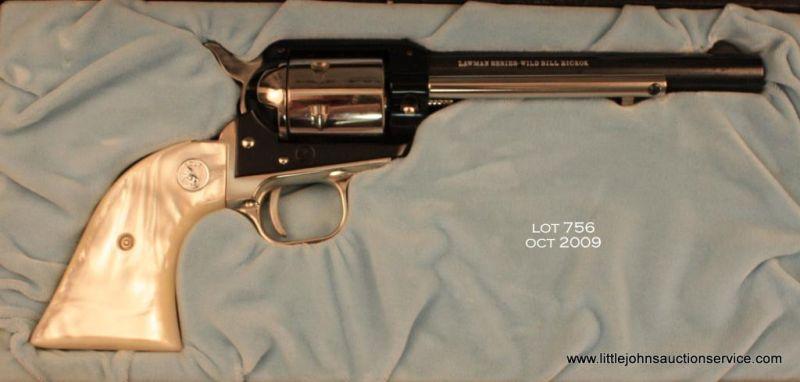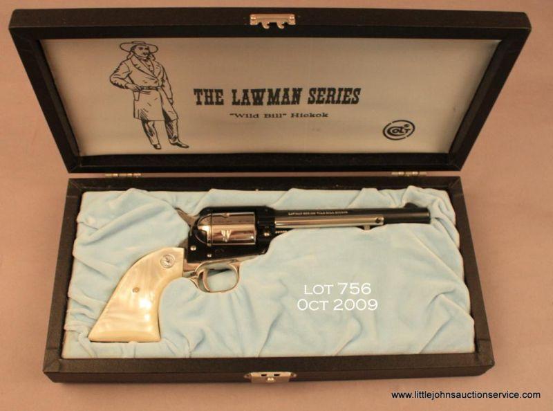 Cased Colt Lawman Series Commemorative SAA Scout “Wild Bill Hickok”, .22 cal., 6” barrel, blue and nickel finish, faux pearl medallion grips, #1045WB. This gun is in near mint condition showing 99%+ original finish. Est.: $300-$500.