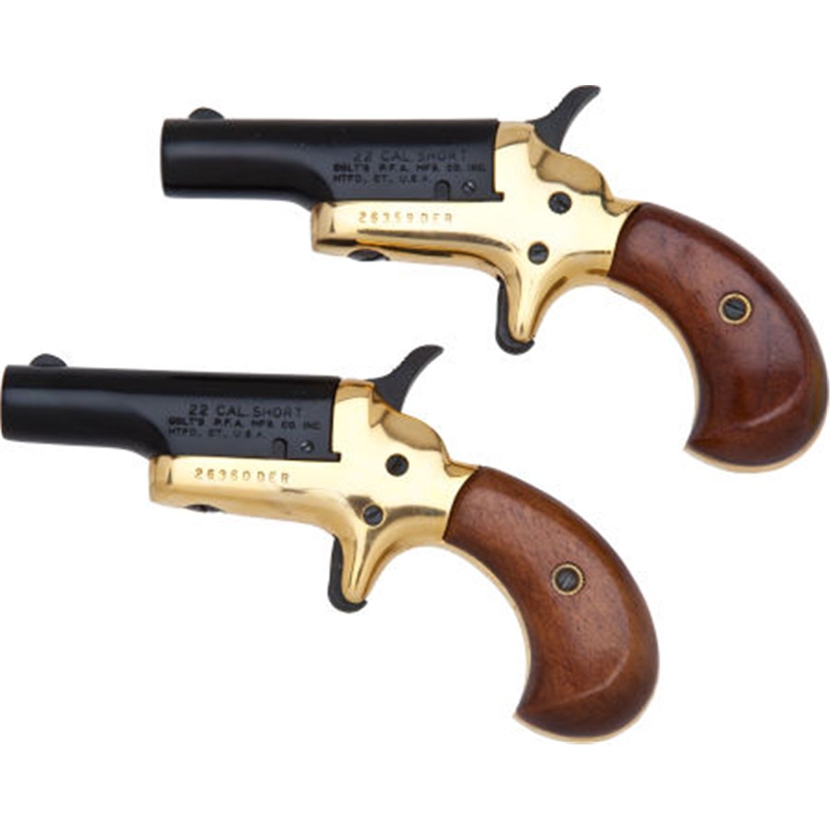 Cased Colt Lord Deringer Set. Serial nos. 26359DER & 26360DER, .22 caliber, 2 1/2-inch blued barrels. Brass frames with spur triggers. Varnished walnut bird's head grips. Both contained in original red velvet-lined factory case with pictorial lid and rampant Colt logo inside lid. Condition: Excellent. NRA FIREARMS FOR FREEDOM PROGRAM