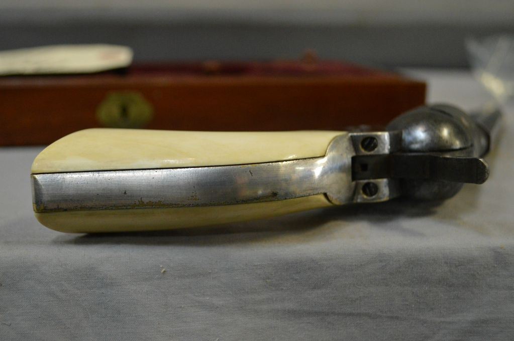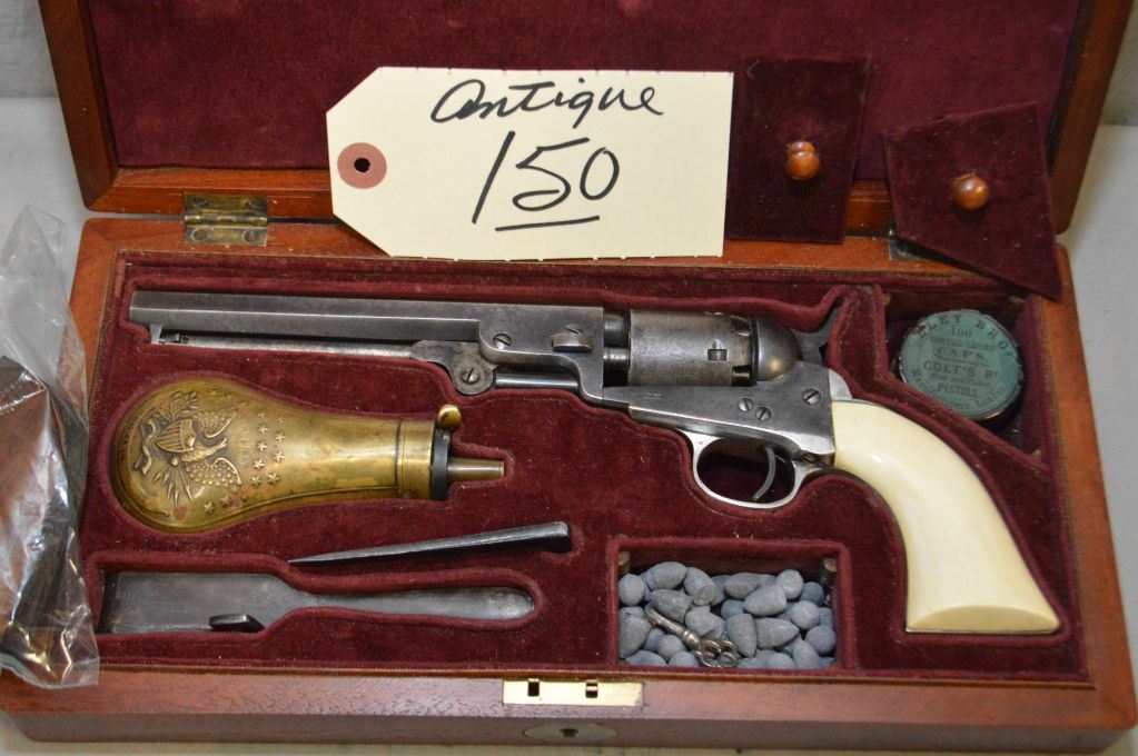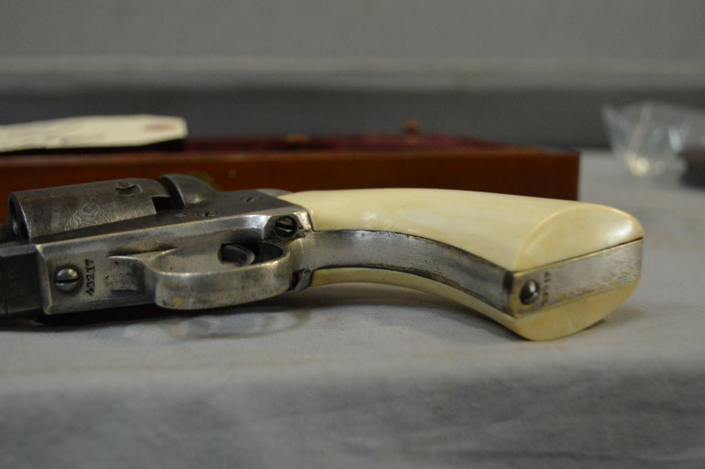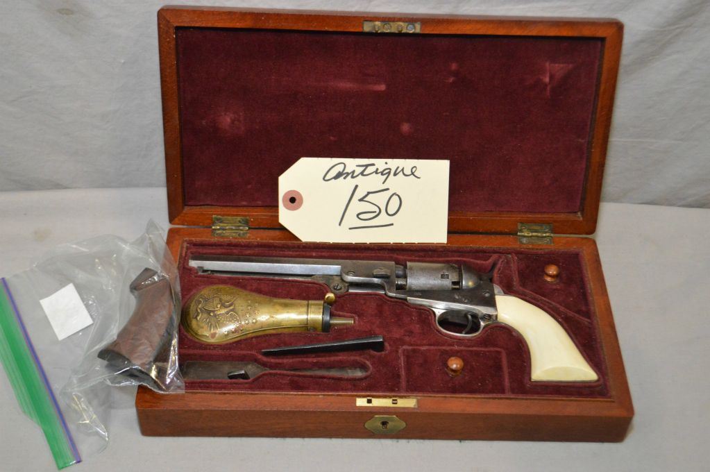 Cased Colt Model 1849 Pocket .31 Perc Cal 5 Shot Revolver w/ 6" octagon bbl [ all matching numbers including the cylinder, blued finish starting to fade, good rolled cylinder scene " Stagecoach hold up", c/w original factory walnut grips that appear excellent , number faintly marked in pencil, also mounted on gun, factory ivory grips with slight age cracks, silver plated brass rounded trigger guard and straps, shows some slight wear to the plate, Two Line Address "Address Sam L Colt New York City", left side stamped "Colt's Patent", also stamped "Colt's Patent" above serial number on cylinder, comes in fitted mahogany case, with small brass embossed powder flask with nice old patina "Eagle & Shield with Stars, E. PLURIBS. UNUM" on both sides - tool, bullet mold, Colt Percussion caps, lead bullets, and comes with key to lock the case, Circa 1853 ] Ser # 43217