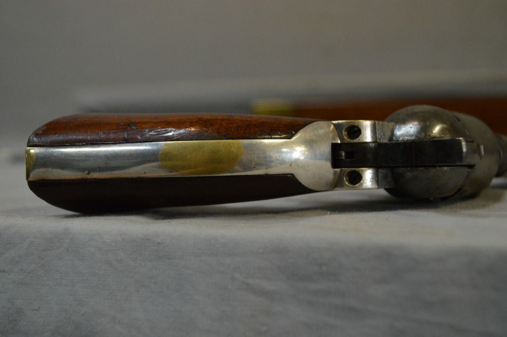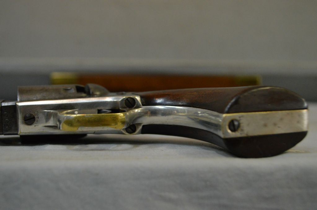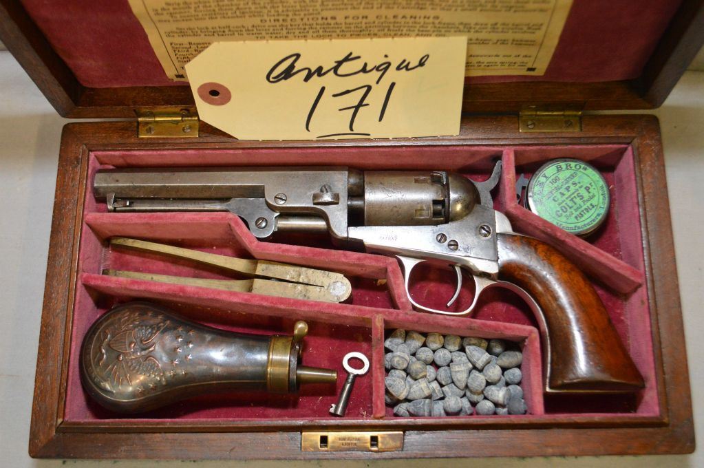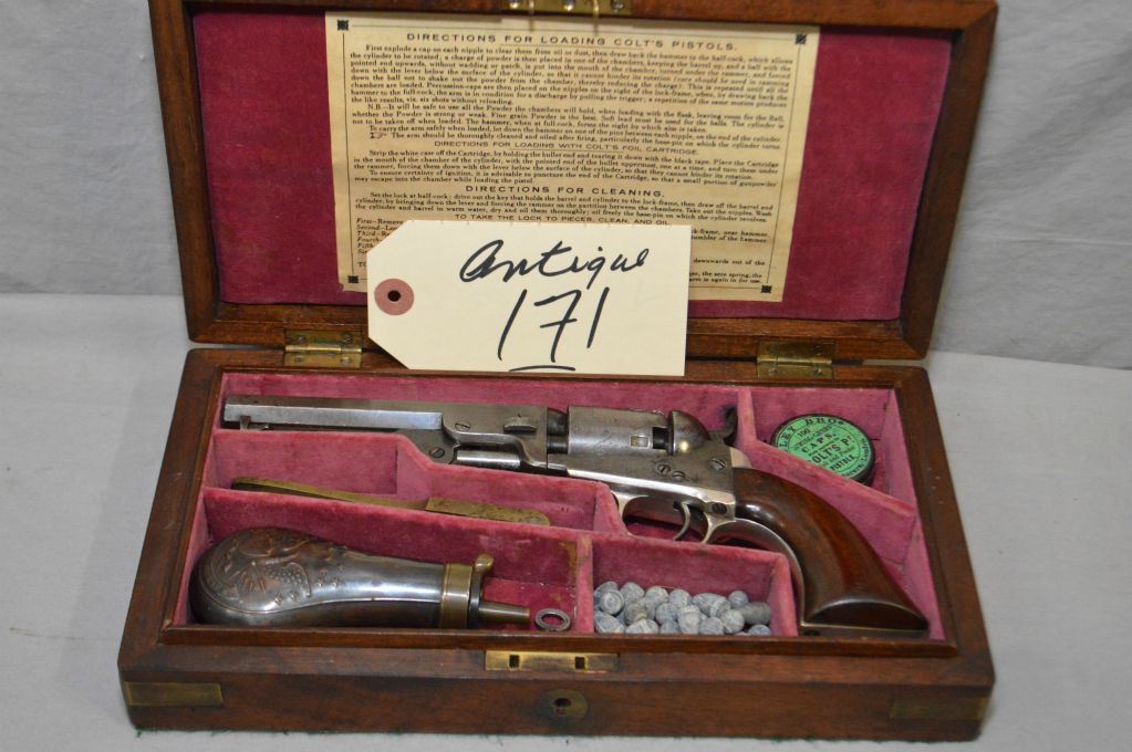 Cased Colt Model 1849 Pocket .31 Perc Cal 6 Shot Revolver w/ 5" octagon bbl [ all matching numbers including the cylinder, blued finish starting to fade, good rolled cylinder scene " Stagecoach hold up", walnut grips, silver plated brass trigger guard and straps, shows some wear and flaking to the plate, One Line Address "Address Sam L Colt New - York USA" , left side stamped "Colt's Patent", also stamped "Colt's Patent" above serial number on cylinder, comes in mahogany case with attached paper instructions for loading Colt pistol in the lid, c/w small copper and brass embossed powder flask with nice old patina "Eagle & Shield with Stars, E. PLURIBS. UNUM" on both sides - tool, brass bullet mold, Colt Percussion caps Note: if shipped, caps will have to be removed from tin prior to shipping , lead bullets, and comes with key to lock the case, Circa 1862 Civil War era ] Ser # 192131 ANTIQUE NO PAL REQ
