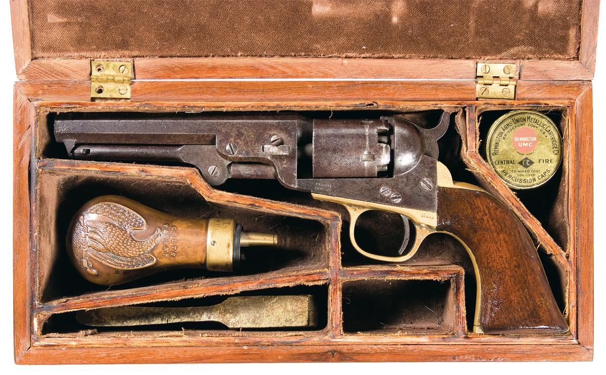 Manufactured in 1868. The top of the barrel flat has the one line "ADDRESS COL SAML COLT NEW-YORK U.S.AMERICA" marking, the mis-matched cylinder is roll-engraved with the Stagecoach holdup scene, "COLTS PATENT" and is numbered, "1071". The left side of the frame is marked "COLTS / PATENT" and the left trigger guard shoulder is marked "31 CAL". Complete matching serial number on the barrel, frame, trigger guard and backstrap, partial number "06767" on the wedge and "6767" on the arbor pin and the loading lever is un-numbered. The barrel and cylinder were blue, casehardened frame, hammer and loading lever, and silver plated brass trigger guard and backstrap. Complete in a homemade brown velvet lined hardwood case with five compartments with a Colts Patent eagle powder flask, two chamber "COLT'S / PATENT" brass bullet mold and a partially full Remington UMC cap tin.