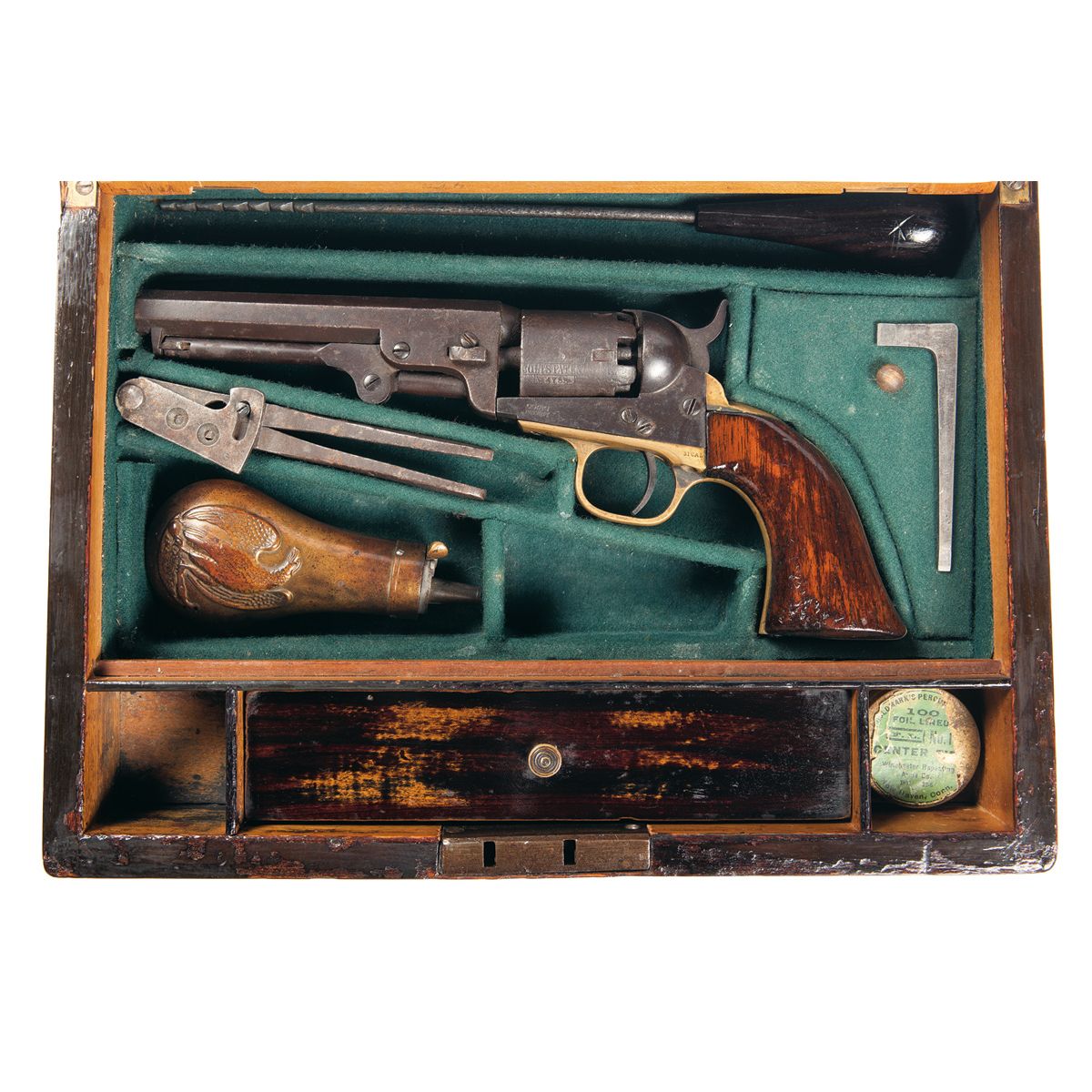 With cleaning rod, Colt bullet mold, powder flask, tool, lead projectiles and tin of percussion caps, (partially full). Manufactured in 1864.
