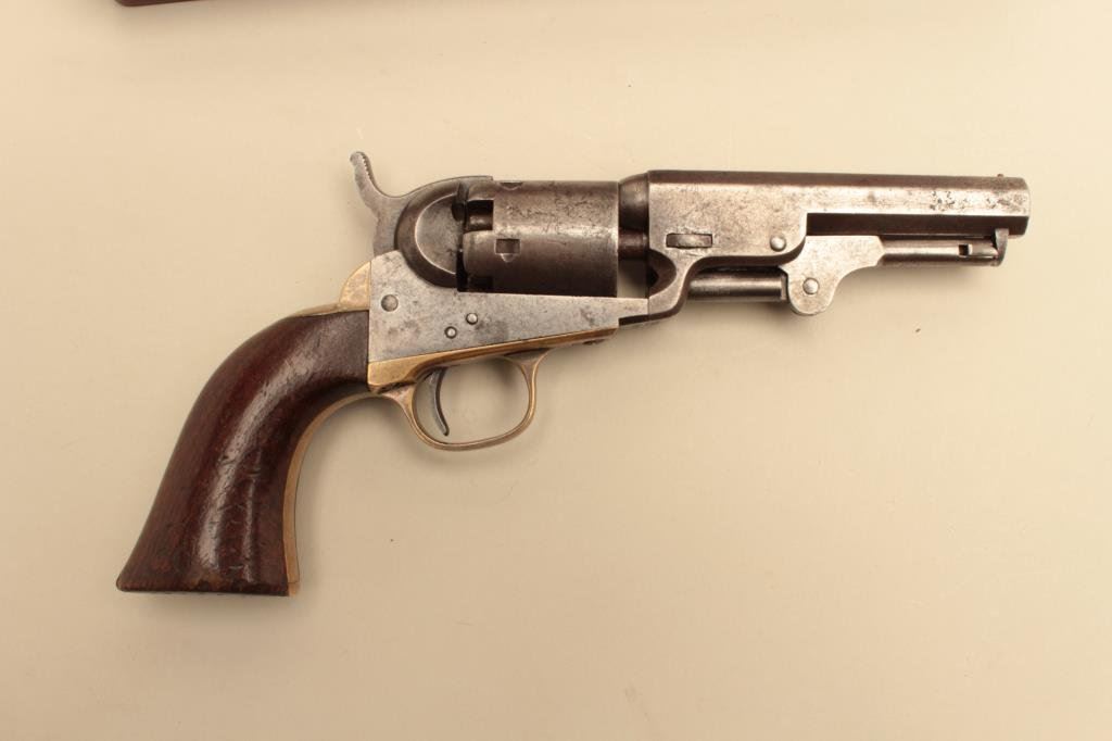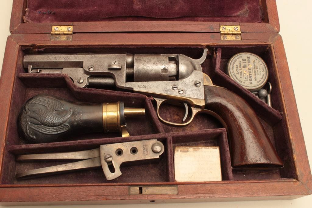 (except flask); revolver is .31 caliber with a 4” octagon barrel, wood grips, S/N 152606 (all matching visible S/Ns), in overall good condition showing a grey patina to metal surfaces with scattered areas of light pitting, good action, markings and grips. Good casing with good iron bullet mold, cap tin and Hazard’s Powder 6 cartridge envelope. (Antique). Est.: $1,400-$2,800.