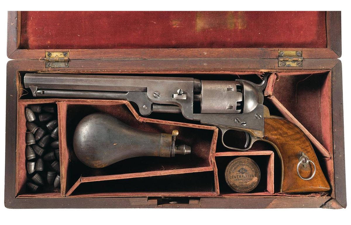 Manufactured in 1853. One line New York barrel address, "COLTS/PATENT" on the left side of frame and navy battle scene on cylinder. The upper left front of the trigger guard is marked "H". Matching serial number on the frame, trigger guard, loading lever, cylinder and back strap, with the partial serial number "1865" on the wedge and "865" on the cylinder pin. No serial number is present on the barrel which appears never to have had one. Fitted with a smooth grip. A slot has been cut into the back strap and wood removed from the inner grip, and a securing pin added thru the grip for possibly a shoulder stock of some sort. In a mahogany case with red velvet lining and six compartments with a powder flask, several conical lead bullets and partial tin of UMC percussion caps.