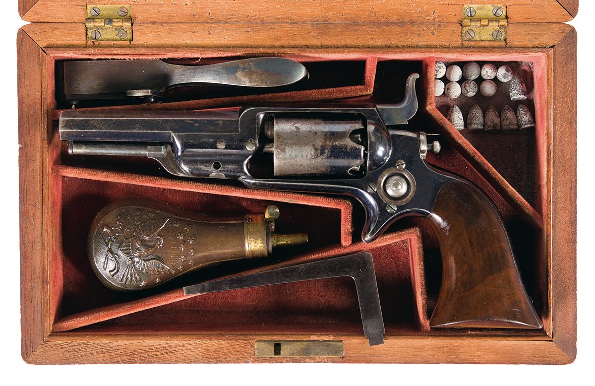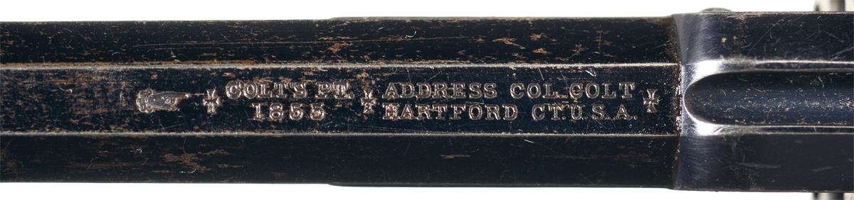 Manufactured in 1856. The top barrel flat is marked "COLT'S PT. / 1855" followed by " ADDRESS COL. COLT / HARTFORD CT U.S.A." with the pointing finger and Maltese crosses. The cylinder is roll engraved with the Cabin and Indian Fight scene and marked "COLT'S PATENT / No 14659. All blue finish with casehardened hammer, loading lever and fire blue trigger, pin front and frame notch rear sights, and fitted with a smooth one piece walnut grip. Matching serial number on the butt, barrel and cylinder. Complete in a wooden case with red velvet lining, eagle shield flask, "L" shaped screwdriver, approximately 14 round and conical lead bullets and two cavity bullet mold with the sprue marked "COLT'S / PATENT".