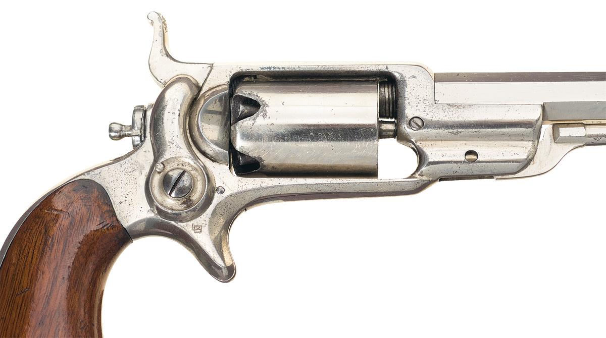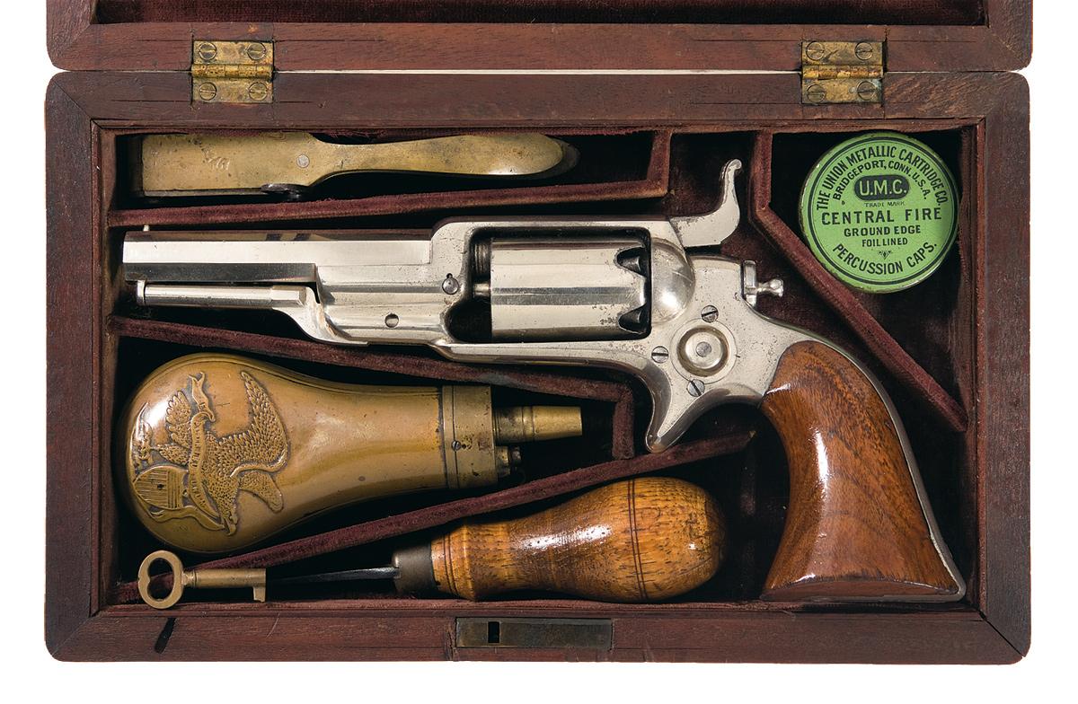Produced in 1855. Pin and notch sights, with "COLT'S PT. / 1855" followed by "ADDRESS COL. COLT / HARTFORD CT U.S.A." with the pointing finger and Maltese crosses on the top flat of the barrel. Checkered hammer spur and smooth trigger, with 3 box shaped stamps below the hammer. Smooth one piece walnut grips. With a wooden case lined in brown velvet, with a brass 2-chamber bullet mold, rare original Root screwdriver with a wooden handle, U.M.C. percussion cap tin (approx. 15 caps), brass powder flask with American Eagle, shield and banner and lead bullets, round and conical.