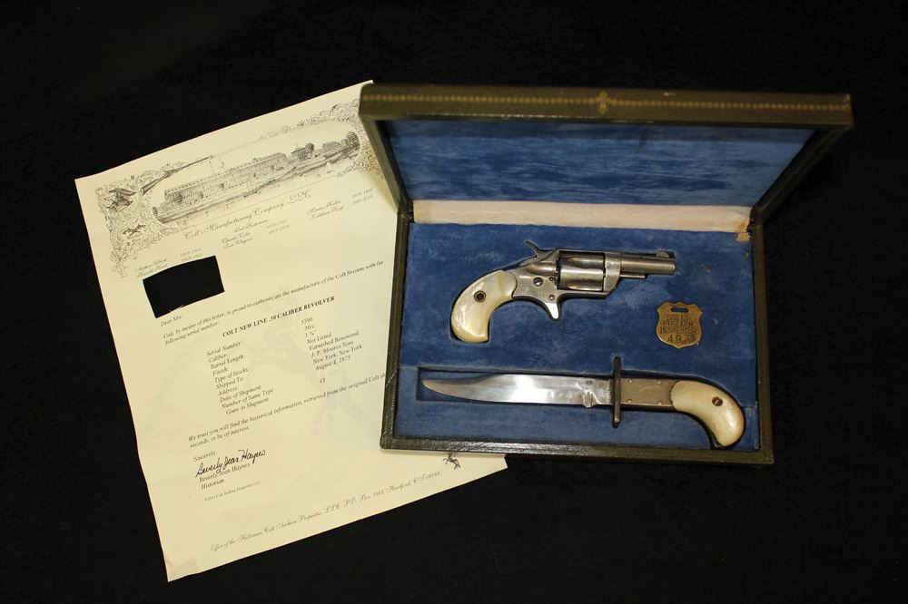 Serial #5590. An etched panel 30 caliber with a 1 3/4" barrel and nickel finish. The factory indicates that this gun was sent to JP Moore of NYC on Aug. 4, 1875. There it received a custom French fitted case, pearl grips and a matching push dagger of similar style and pistolgrip, and also marked with matching serial number, which was common practice of Moore at the time. A rare and fantastic piece.