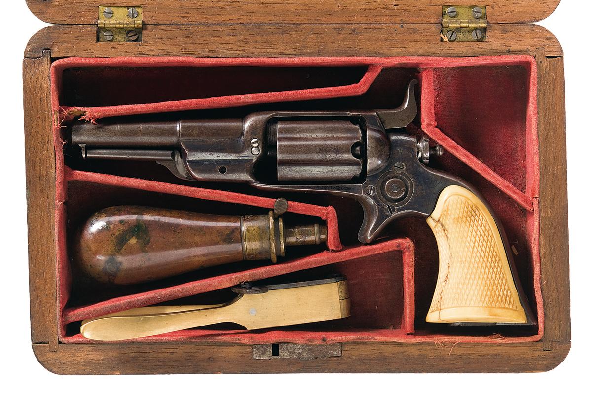 Model 5 version, produced circa 1862. Front post sight with notch rear sight, marked with the two line New York address on top of the barrel, patent markings in one of the cylinder flutes and on the cylinder pin. Full fluted cylinder, checkered hammer spur and smooth spur trigger. Grips are checkered one piece wraparound ivory. Walnut case lined with red velvet with Dixon bag powder flask and reproduction bullet mold.