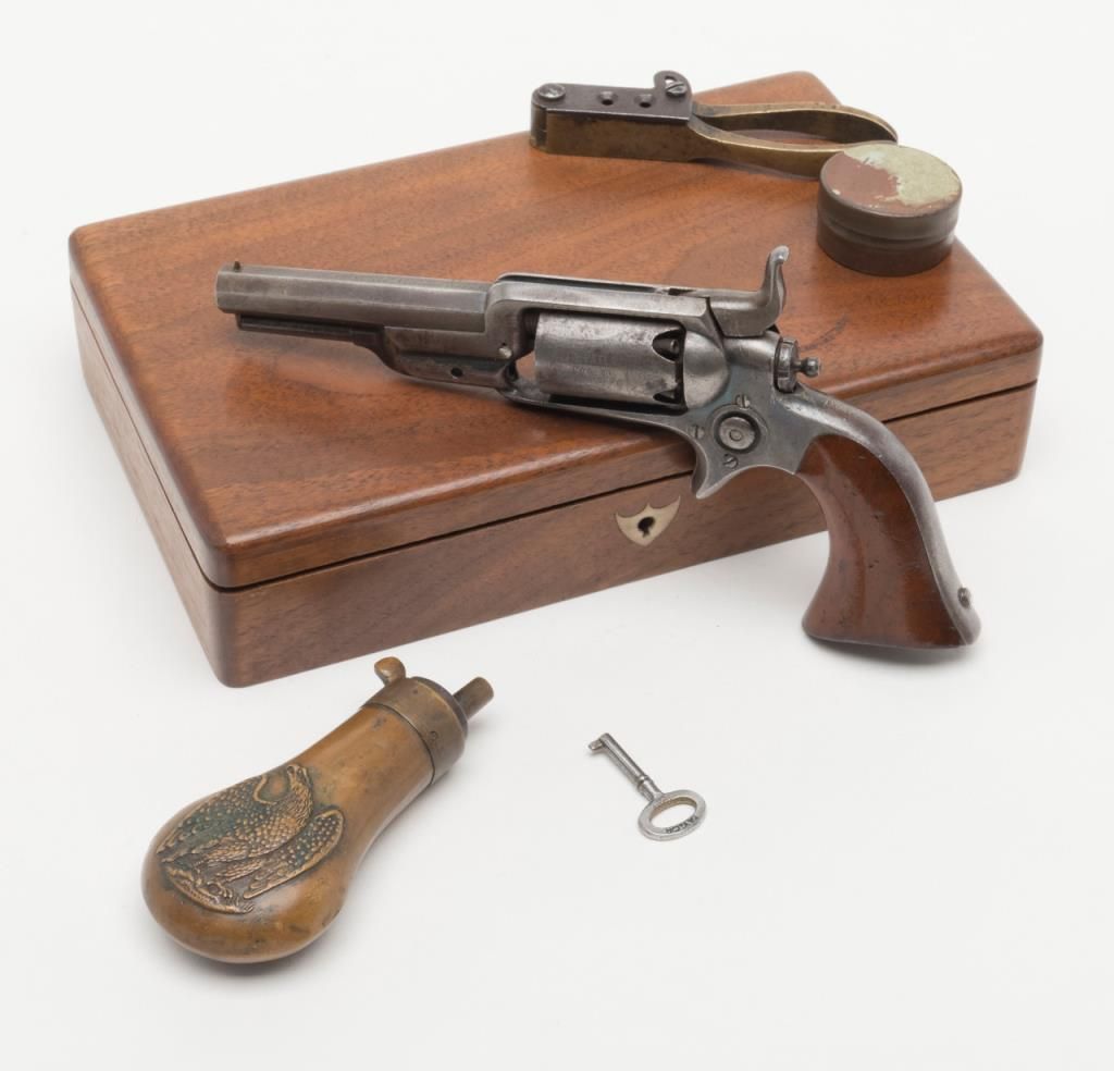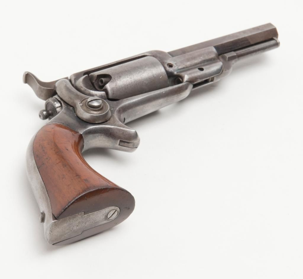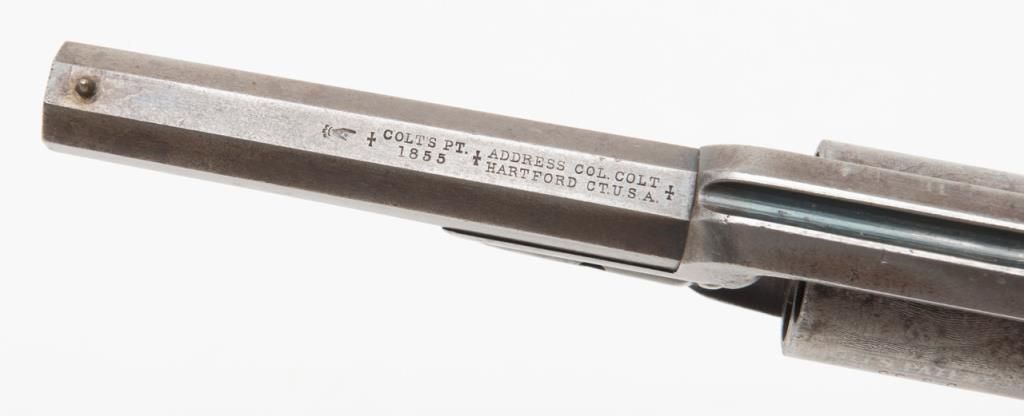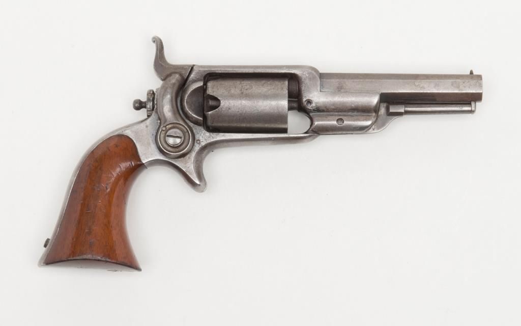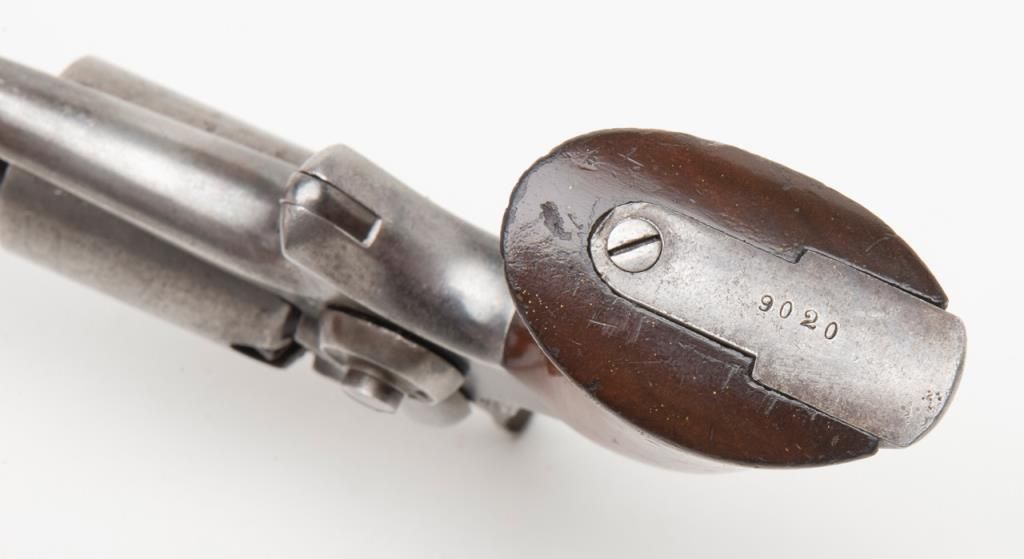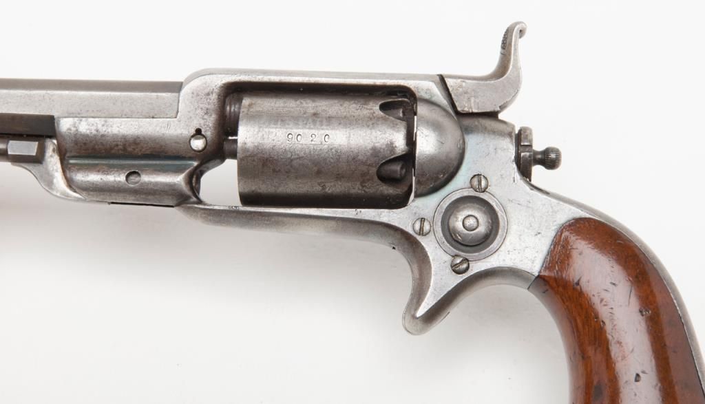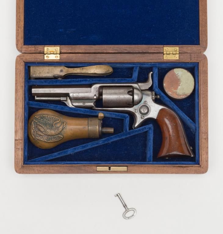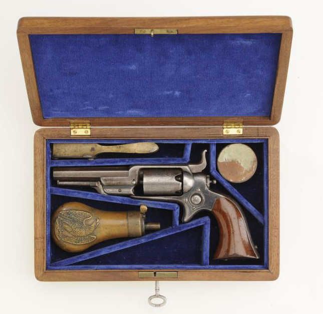 Cased Colt Root Model No. 2 percussion spur trigger revolver, .28 cal., 3-1/2” octagon barrel, round cylinder, wood grips, #9020. This gun is in overall very good to near fine condition showing approx. 25% original finish, matching visibleserial numbers, considerable original cylinder scene remaining, fine wood grips, good bore, action needs work; accompanied by an expertly made reproduction wood casing with finely made partitions and lining including correct brasshinges and lock with functioning key (a labor of love constructed by a craftsman and so expertly accomplished that it could fool some as appearing completely authentic and of-the-period); original accessories include an eagle brass flask withbeautiful dark patina, a Colt’s Patent brass bullet mold and an Eley cap tin. (Antique). Est.: $1,600-$3,200