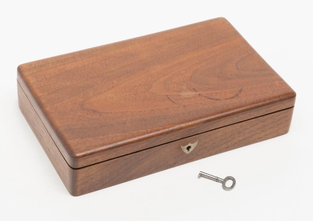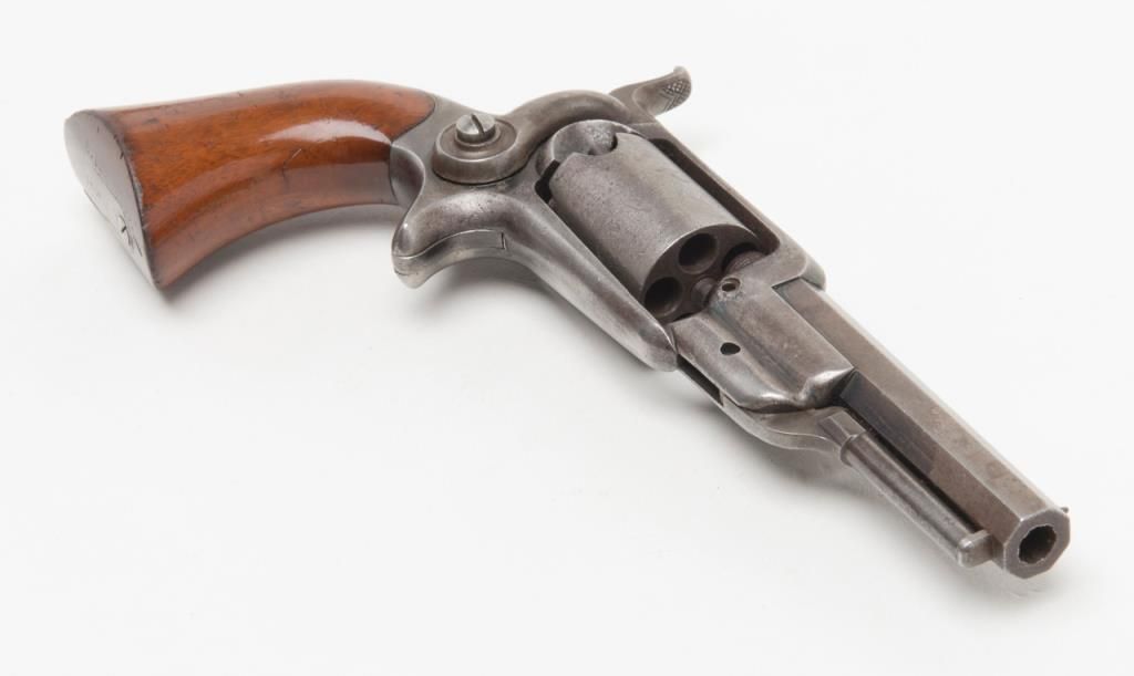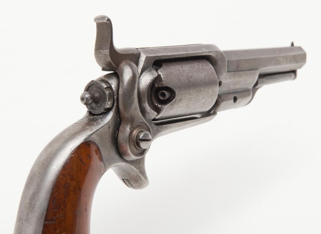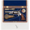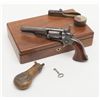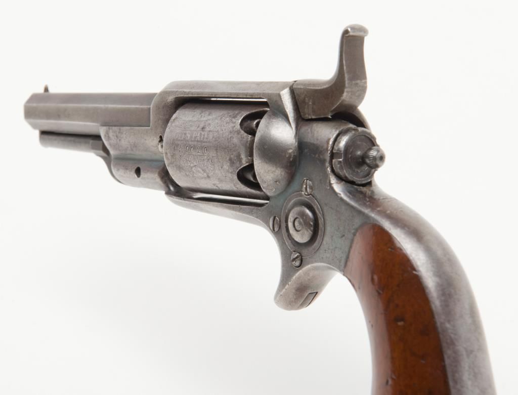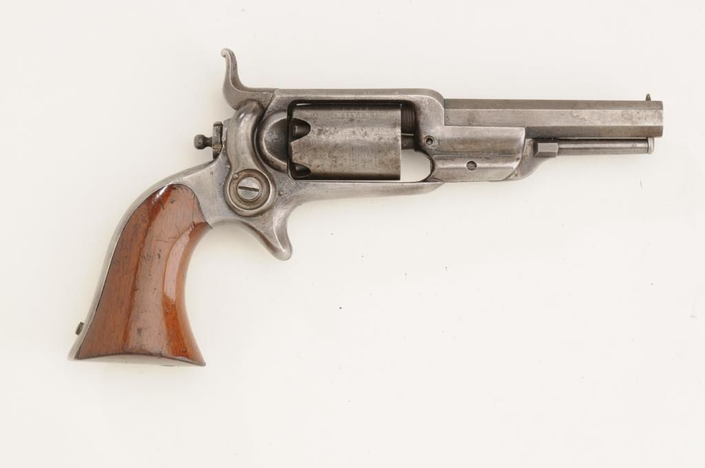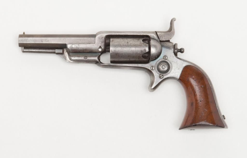 Cased Colt Root Model No. 2 percussion spur trigger revolver, .28 cal., 3-1/2” octagon barrel, round cylinder, wood grips, #9020. This gun is in overall very good to near fine condition showing approx. 25% original finish, matching visibleserial numbers, considerable original cylinder scene remaining, fine wood grips, good bore, action needs work; accompanied by an expertly made reproduction wood casing with finely made partitions and lining including correct brasshinges and lock with functioning key (a labor of love constructed by a craftsman and so expertly accomplished that it could fool some as appearing completely authentic and of-the-period); original accessories include an eagle brass flask withbeautiful dark patina, a Colt’s Patent brass bullet mold and an Eley cap tin. (Antique). Est.: $1,600-$3,200