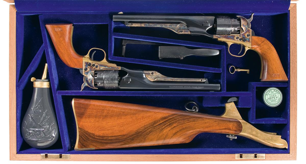 A) This set includes matching 1860 Army revolvers, with standard commemorative markings, accessories including the brass and walnut shoulder stock serial numbered to match. Complete in a fitted walnut case.