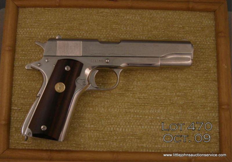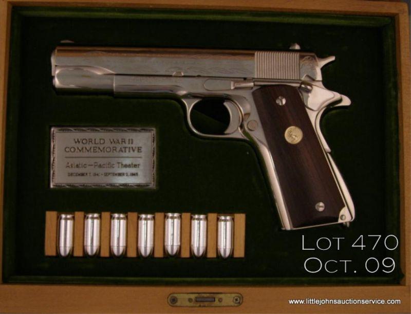 Cased Colt WW II Commemorative Pacific Theater of Operations 1911-A1 semi-auto pistol, .45 cal., 5” barrel, nickel finish, smooth wood Colt medallion grips, #3690 PTO. This gun shows approx. 99% original nickel with engraved ornamented slideshowing battle names, fine bore, action and grips; case is light wood with glass viewing top and lid shows the surrender of the Japanese at Tokyo Bay on Sept. 2, 1945. Interior of case is lined and contains 7 nickel .45 dummy rounds in wood block Est.: $400-$600.