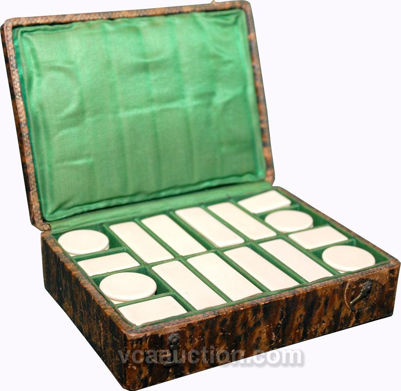 Cased Cuban Bone Chip Set - Complete set of thick bone counters from Cuba with 80 long, 40 short, and 40 round counters in a distinctive 7½" x 5½" x 2½" case. Case closes and locks nicely; green satin interior and outer case veneer in excellent condition.