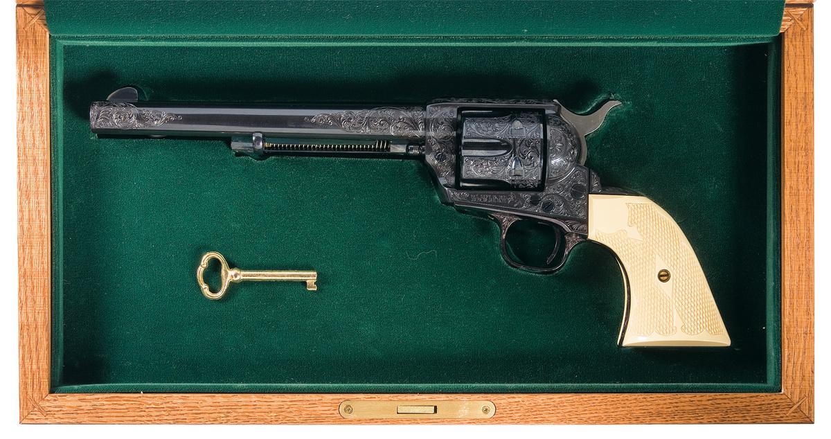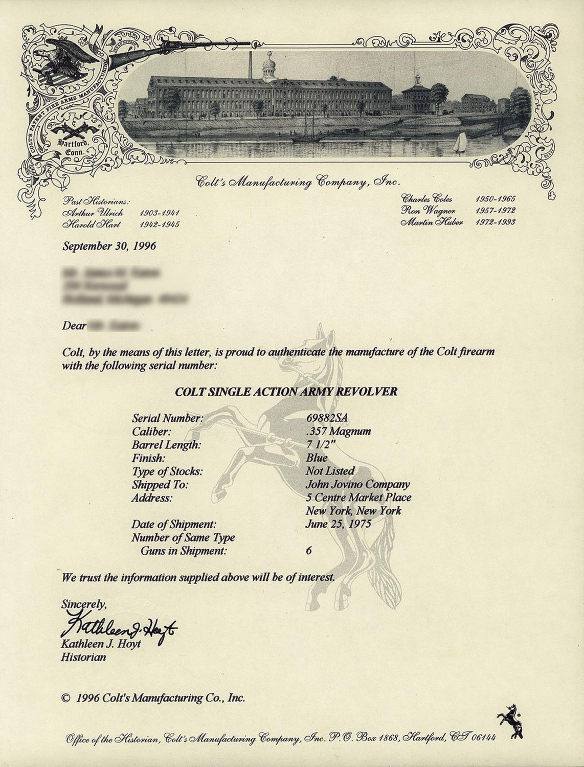Manufactured in 1975 and subsequently with custom embellished "B" style engraving, which includes floral scroll engraving with punch-dot background, and checkered simulated ivory grips. The sights are a blade front and rear notch. Matching serial numbers on the bottom of the frame and the left side of the front and backstraps under the grips. The gun is complete with a Colt branded oak presentation case with hunter green velvet interior and a factory letter stating it was shipped to address of "John Jovino Company/ 5 Centre Market Place/ New York, New York" and date of shipment as "June 25, 1975".