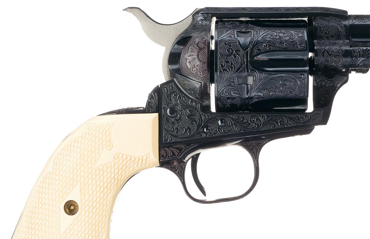 Condition: Custom embellished and factory-quality refinished with virtually all of the high polish blue finish remaining. Cylinder shows a faint drag line on cylinder stop approaches. Gun has slight overall handling marks. Grips are ill-fitting with slight handling marks. Presentation case is excellent.