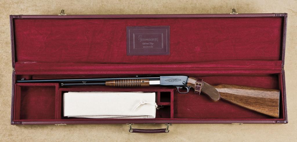 Cased Custom Shop Belgian Browning Grade 1 “Trombone” pump action rifle, .22 short, long and long rifle cal., 22” round barrel, blue finish, checkered deluxe wood stocks, #166CS01610. This gun is in overall like new condition showing 99% + original finish, tastefully engraved receiver, fine bore, crisp action, sharp markings, excellent deluxe wood stocks with finely checkered pistol grip and steel butt plate. The case is a Browning Custom Shop leather covered wood suitcase style with two brass locks and leather handle; interior is red baize lined with compartments for the gun, a protective “sock” and factory instruction manual. Est.: $1,250-$2,500.