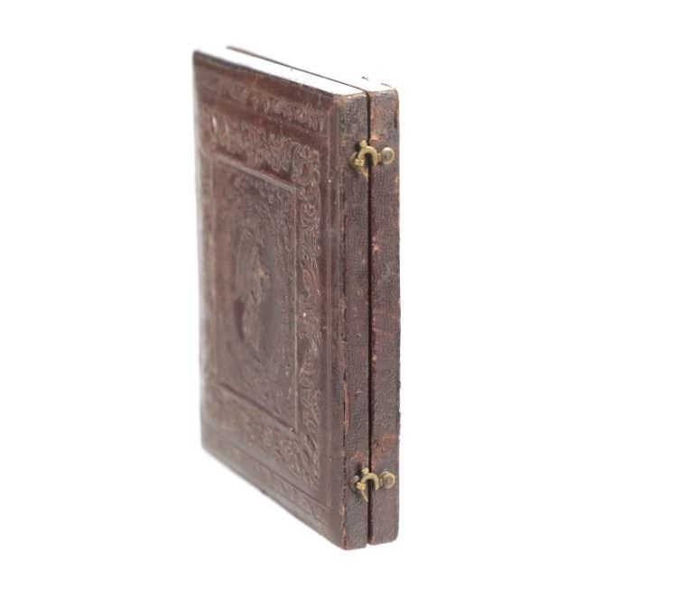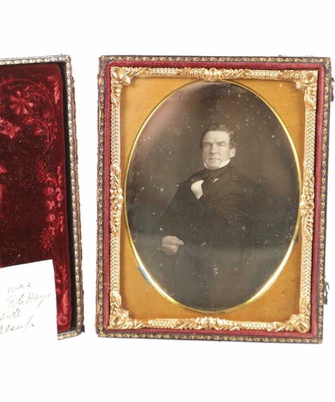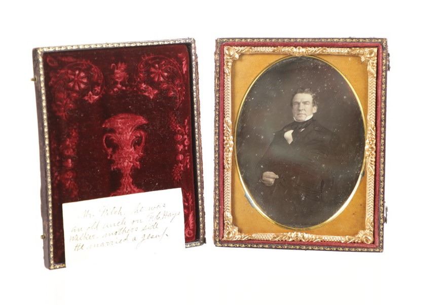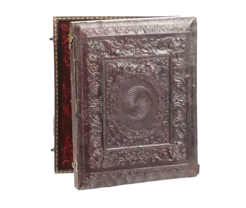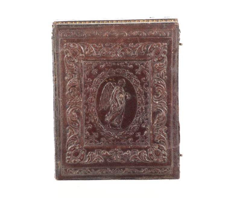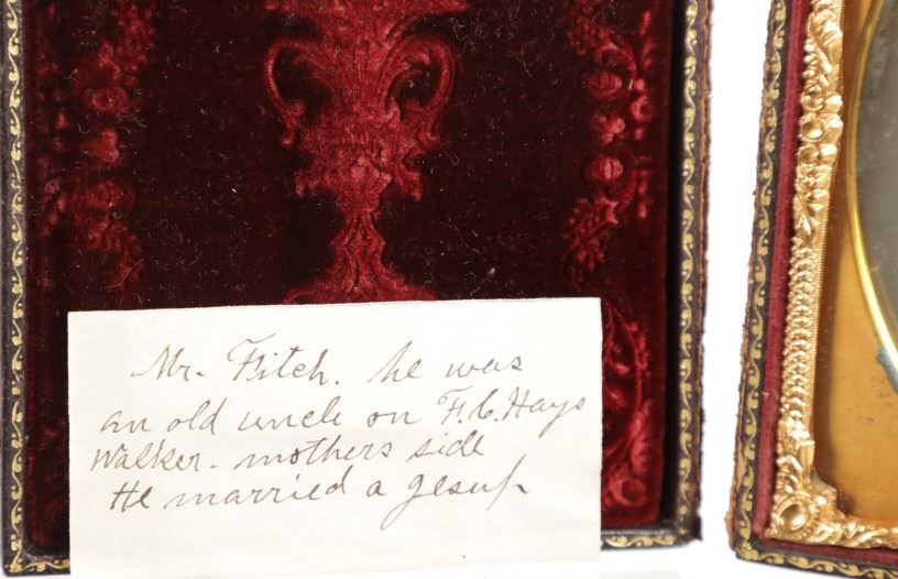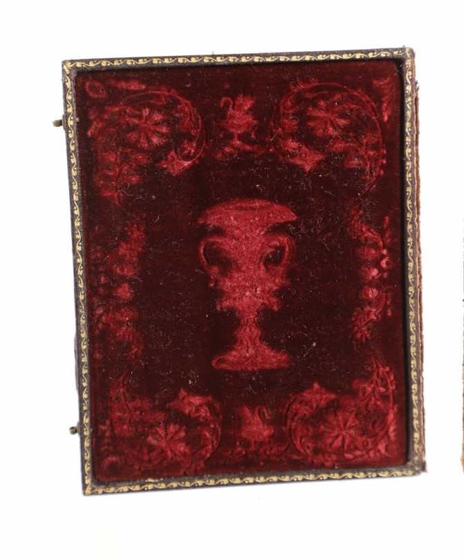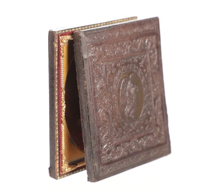 For your consideration is this 1850-70s daguerreotype of Mr. Friteh, an old Uncle on Frances G. Hays Walker mother's side. The daguerreotype is housed in a gorgeous embossed case showing floral and scroll designs around a center piece of an angel. One side of the inside of the case shows a scroll design, red wine colored felt with a vase image set in the center. The opposite side shows the daguerreotype of Mr. Friteh. He is wearing a nice suit and has combed, slicked back hair as he looks directly towards the viewer. The case shows fair condition as the front cover is completely detached but can be partially connected with the two hooks on the side. The photo shows good condition overall with no signs of damage. The case measures 4 9/16" L x 3 5/8" W x 5/8" D.
