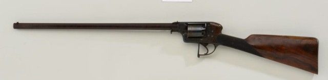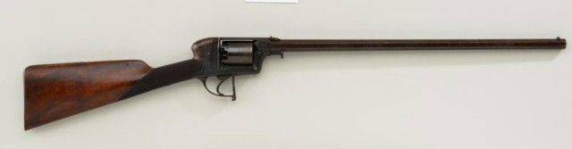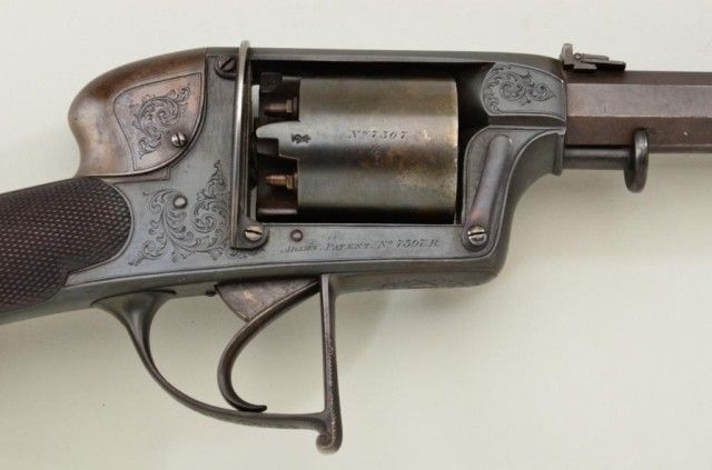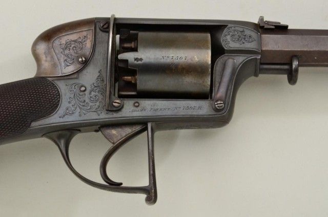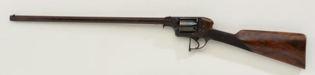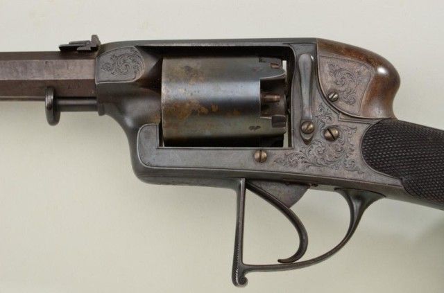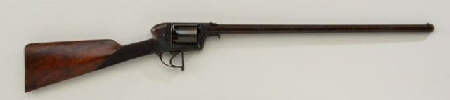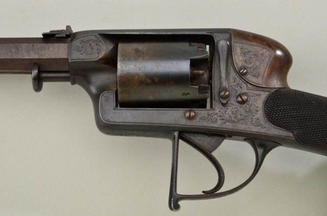 Cased Deane Adams & Deane DA percussion revolving carbine patent #7507R in approx 50 cal with 5 shot cyl measuring 40-1/2” overall with approx 23-1/2” barrel which is numbered 127 on bottom. The top of the frame showsaddress of 50 King William St., London Bridge. The carbine remains in very good condition with considerable original brown stripping on barrel and blue on frame. At least 50% with some storage type dirt and new rust that would clean. There is a hammer shroud attached to the back of the frame by small screws which is a factory accessory made by Deane. The frame and mounts are nicely engraved, the stock is select qualityand checkered. The butt plate and trigger guard show 75-85% toning blue. The stock is very good with a couple of dings and mars and dents to the checkering. There is some fresh rust 1-1/2” back from the barrel on the left side, which has mostly cleaned but may have lightly pitted the metal. The action is crisp and the carbine is crisp overall needing a careful deep cleaning. The case shows a Deane Adams & Deane trade label in